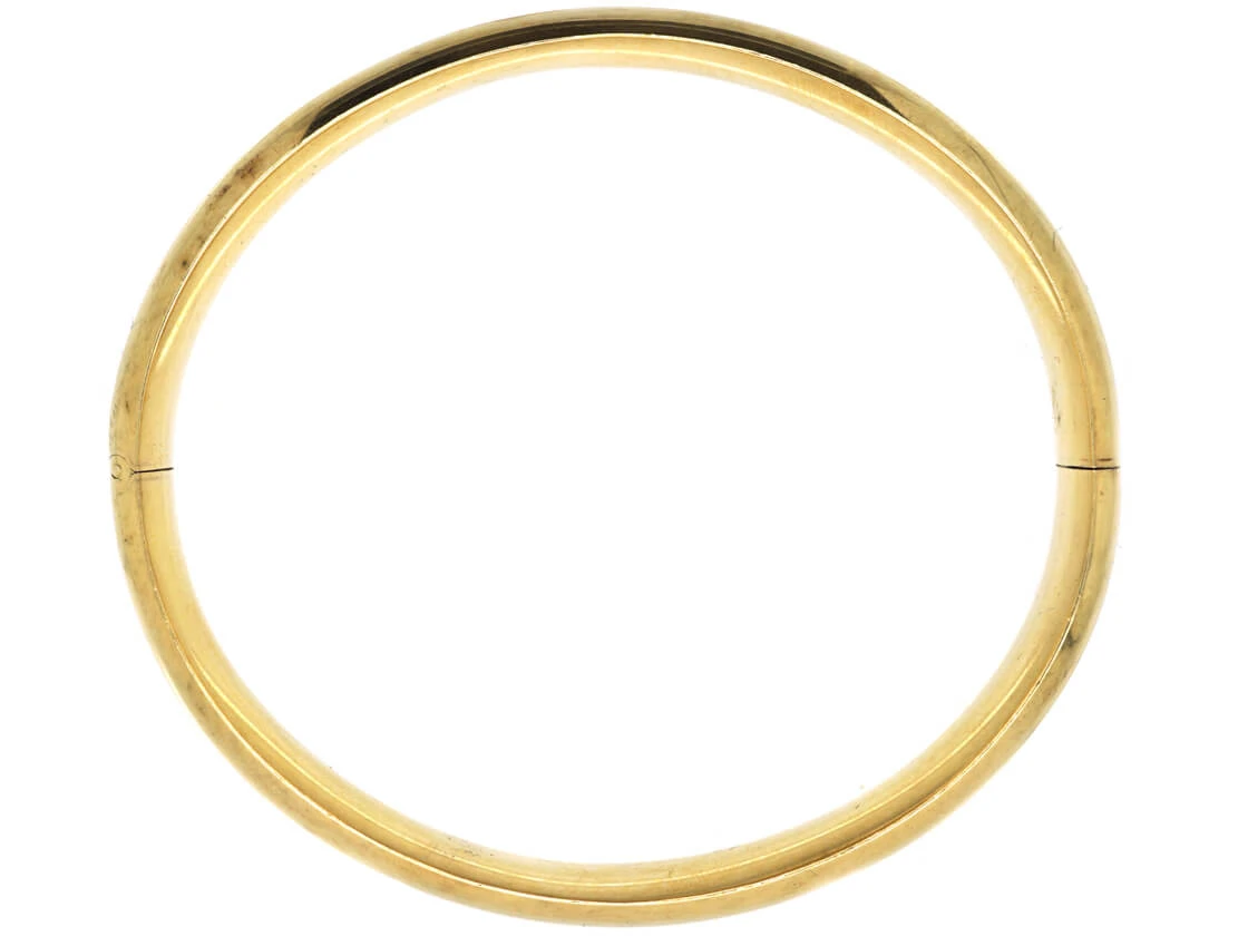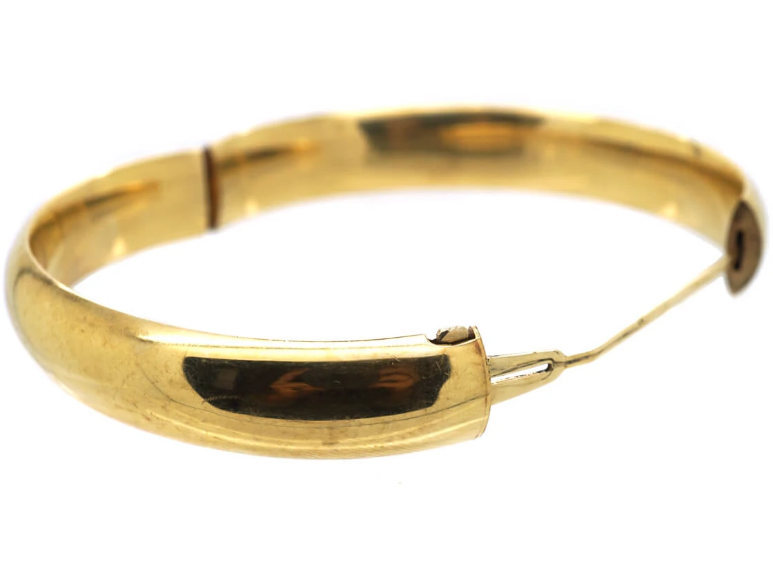 A smart plain 14ct58.5% pure gold (or 585 parts pure gold to 415 parts other metals) gold bangle that was made circa 1950-1960. It has an ingenious opening and closing mechanism that is safe.