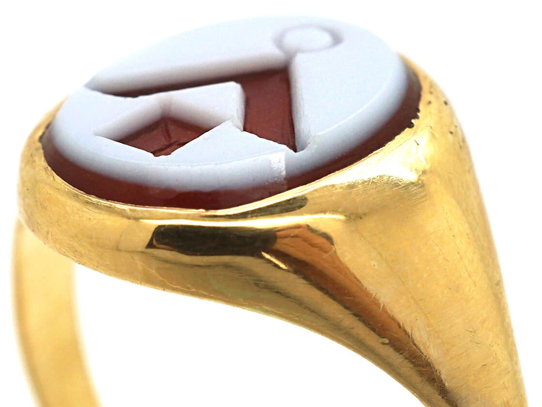 A striking 14ct58.5% pure gold (or 585 parts pure gold to 415 parts other metals) gold signet ringA ring with a central plaque on which one’s initials, a seal, or a crest is engraved. that has been set with an oval carnelian​A translucent red variety of chalcedony which in its turn is a form of cryptocrystalline quartz. ​Carnelian has​ been known and used since antiquity when it was sourced from the surfaces of the Egyptian and Arabian deserts. The ​most prized carnelian has a true blood-red color. with a Masonic intaglioAn engraved stone, the opposite of a cameo, with a recessed design cut below the surface of the stone. Intaglio designs are common for signet rings and fob seals.. It is difficult to say when it was made but I would say in the 1940-1950 period.