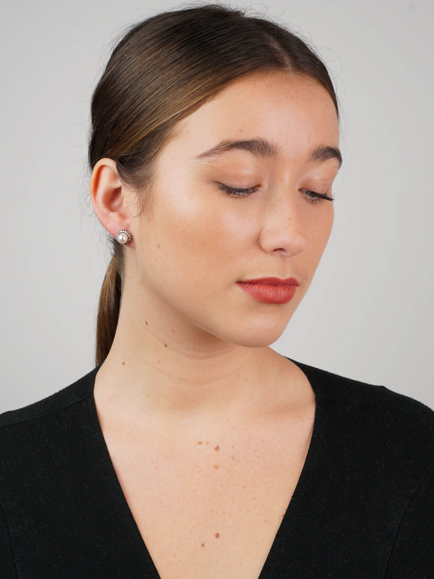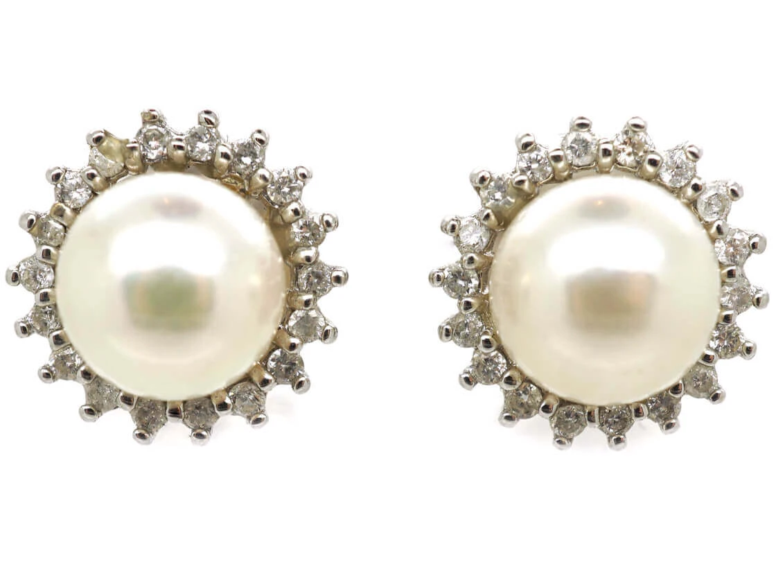 A useful pair of 14ct58.5% pure gold (or 585 parts pure gold to 415 parts other metals) white goldWhite gold is an alloy of gold and at least one other white metal – most often nickel or palladium (both of which act as a bleaching agent to reduce the natural yellow colour of the gold). earrings. Each one has been set with a cultured pearlA man-made pearl. The pearls are produced by inserting an irritant into a mollusk. surrounded by small white diamonds. They have 18ct75% pure gold (or 750 parts pure gold and 250 parts other metals) white gold butterflies. They can be worn day and night so are very versatile.