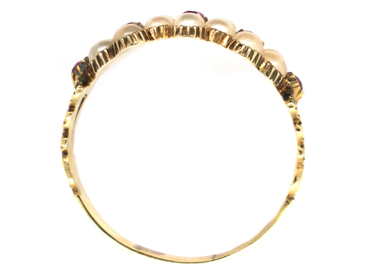 This is such a beautiful ring in fantastic condition. It was made circa 1820 in the Regency period and is typical of the fashions of the time when jewellery was delicate and pretty. Later on in the century the styles became heavier and more ornate. The naturalA natural stone is called such because it has not been subjected to any treatments. split pearls are all original and surround five well matched rubies.