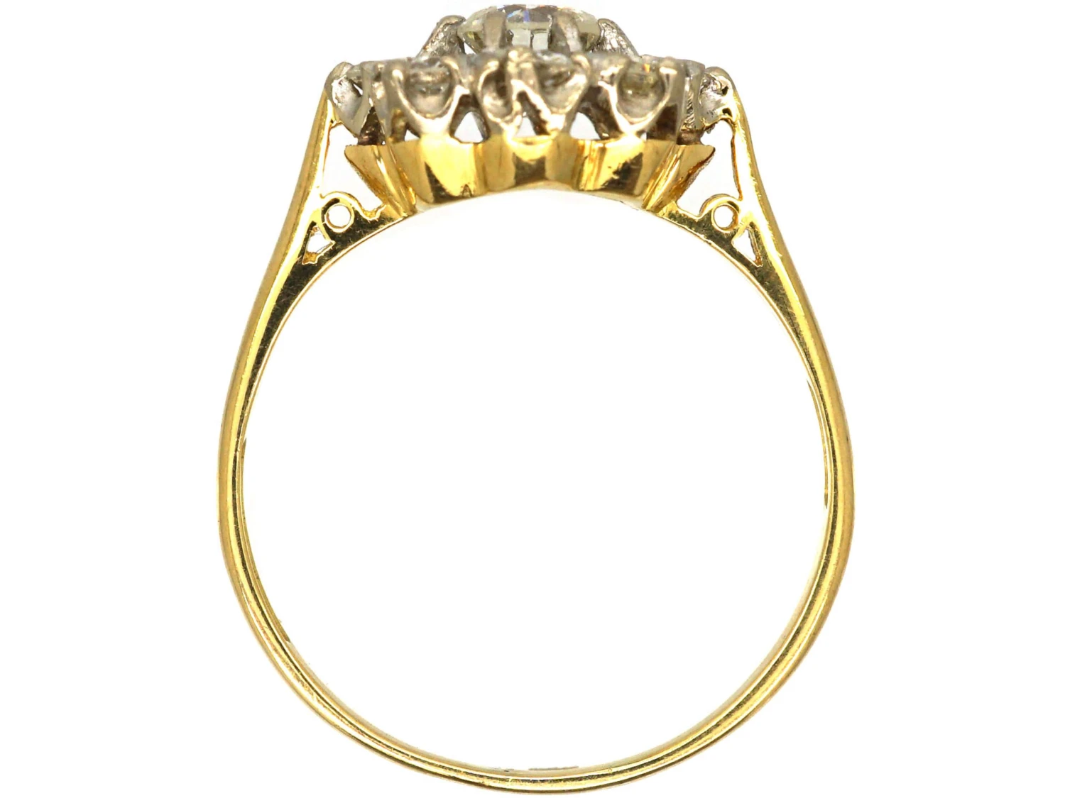 This is such a bright little daisy clusterA group of small diamonds or colourful gemstones grouped together to form a cluster, mimicking the look of a larger gem. Often this group can surround a larger center stone. engagement ring! The nine brilliant cutA circular gemstone cut, especially for diamonds or other transparent stones, with 57 or 58 facets. This cut returns the greatest amount of brilliancy, fire, and white light to the eye, making it an immensely popular cut. Also known as the Modern Brilliant Cut, the American Brilliant Cut, or the Ideal Cut. diamonds totalling approximately 1.07 cts, each clawA precious metal prong used to hold a gemstone in place. set in white goldWhite gold is an alloy of gold and at least one other white metal – most often nickel or palladium (both of which act as a bleaching agent to reduce the natural yellow colour of the gold). so as not to distract from the colour of the well matched stones. The slim shankThe circle of metal that attaches to the decorative part of a ring and encircles the finger. further accentuates the size of the cluster. This ring was designed for that ‘I do’ moment!