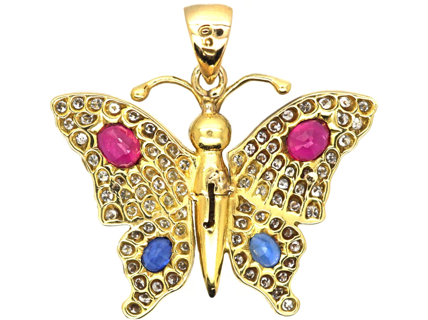 Butterflies have such lovely meanings of rebirth and transformation. This pretty 18ct75% pure gold (or 750 parts pure gold and 250 parts other metals) gold pendant has been set with two rubies and two sapphires and studded with small diamonds throughout. Even the butterflies eyes have been set with two tiny cabochonA polished, not faceted, dome shaped stone – either round or oval with a flat polished base, primarily used as a cut for phenomenal stones such as cat’s eyes and stars.