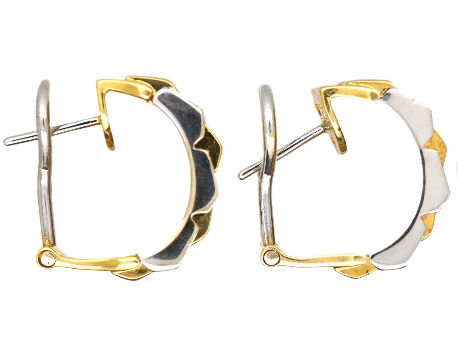 A smart pair of 18ct75% pure gold (or 750 parts pure gold and 250 parts other metals) gold hoop earrings that were made in the 1980s by Chimento. Chimento jewellery, founded in 1964, has quickly become established as one of the finest Italian brands in the world as the pieces are well made and excellent quality. When worn these earrings pick up the light as they are a subtle facetedA faceted stone has small, flat-cut surfaces that make a sparkling effect on transparent stones. Facets act as both mirrors and windows. Reflecting light and channelling light into a stone where it refracts and re-emerges. design. The small diamonds glitter alluringly.