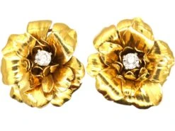 A glorious pair of 18ct75% pure gold (or 750 parts pure gold and 250 parts other metals) gold flower earrings that were made by Cartier in Paris in the 1950s. They are fully signed and numbered. The flowers are so well made. Each flower and petal has its own character and there is a clawA precious metal prong used to hold a gemstone in place. set diamondA precious, lustrous gemstone made of highly compressed carbon. Diamonds are one of the hardest materials known to mankind. Colours of diamonds range from colourless, yellow, orange and brown to almost black. Natural coloured (or ‘fancy’) diamonds can be extremely rare. The cut, colour, clarity and carat weight of a diamond are the criteria jewellers use… in the middle of the flower. They have comfortable secure clip on fittings.