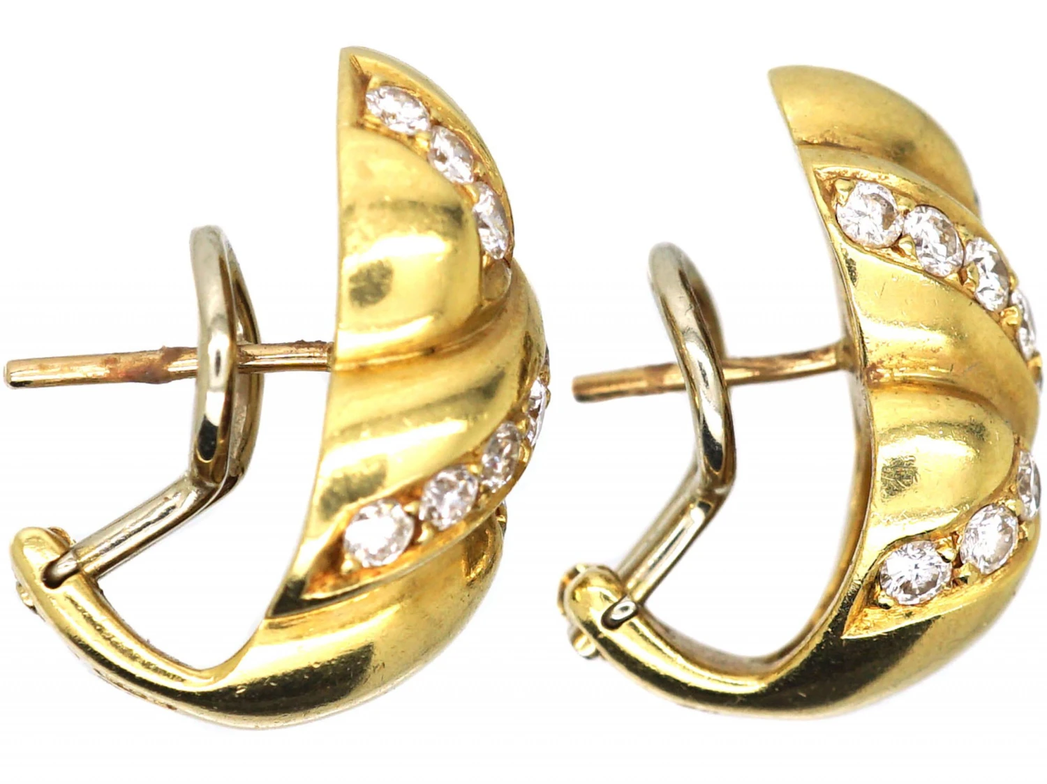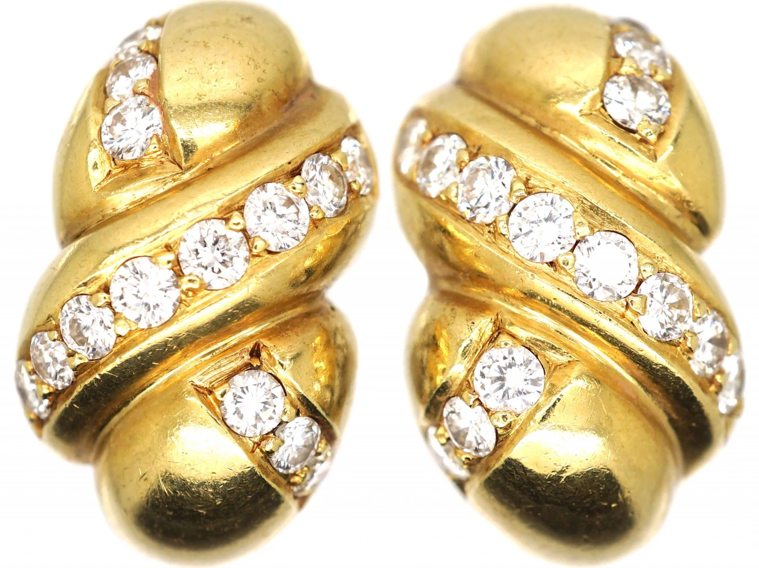 A good looking pair of 18ct75% pure gold (or 750 parts pure gold and 250 parts other metals) gold earrings that have been set with brilliant cutA circular gemstone cut, especially for diamonds or other transparent stones, with 57 or 58 facets. This cut returns the greatest amount of brilliancy, fire, and white light to the eye, making it an immensely popular cut. Also known as the Modern Brilliant Cut, the American Brilliant Cut, or the Ideal Cut. diamonds in a crossover kiss design. They have secure post and clip fittings.