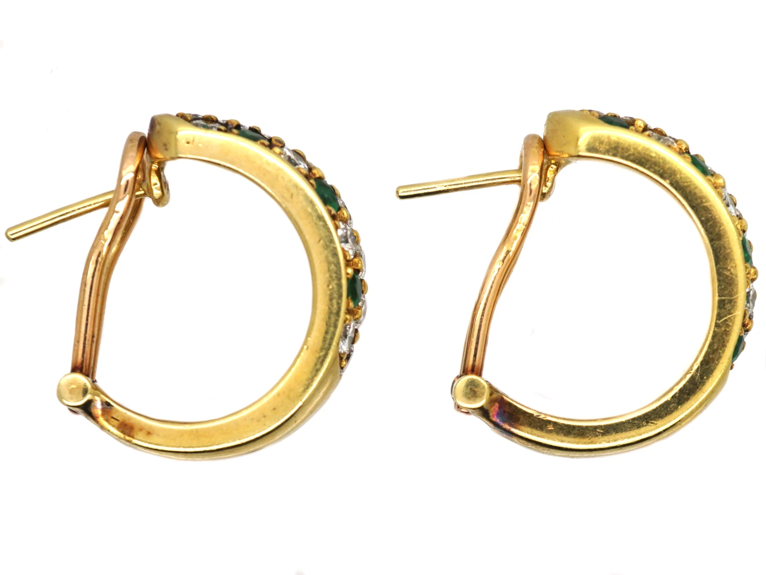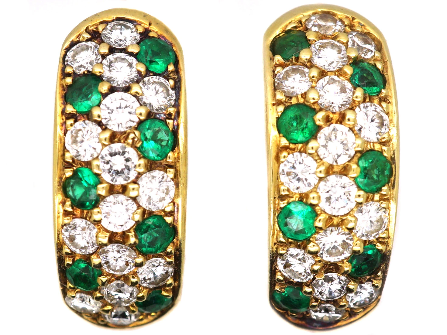 A smart pair of 18ct75% pure gold (or 750 parts pure gold and 250 parts other metals) heavy gauge gold hoop earrings that were made circa 1970-1980. Each earring has been set with seven emeralds and fifteen diamonds in a zig zag design. The diamonds are good bright white stones and the emeralds are a strong saturated green colour. They have secure clip and post fittings.