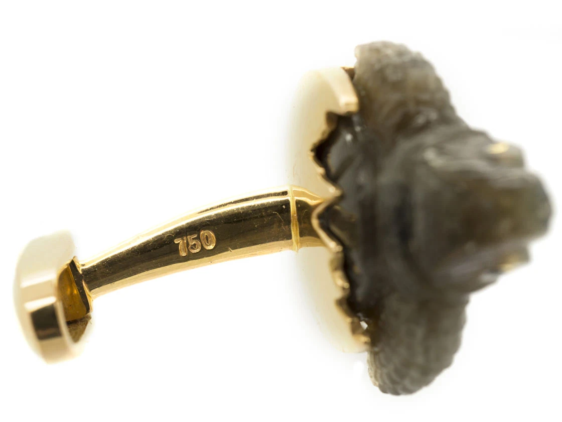 A most unusual pair of cufflinks. The baby turtles are coming out of the 18ct75% pure gold (or 750 parts pure gold and 250 parts other metals) gold shell. They are carved labradoriteA fairly abundant greyish mineral that shows brilliant flashes of colour (usually green, blue or red) after it is polished – a phenomenon called ‘labradorescence’. Labradorite is usually cut with a flat surface in order to highlight the flashes of colour. Labradorite was originally found along the coast of Labrador; it is also found in Newfoundland and… and their eyes are set with tiny, round onyxOnyx is an opaque black variety of polycrystalline chalcedony quartz. .