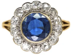 surrounded by fourteen well matched white diamonds. It was made in 1990 in the EdwardianJewellery made in the Edwardian era (1901-1914). style and sits low on the finger so it would be an ideal and practical engagement ring.