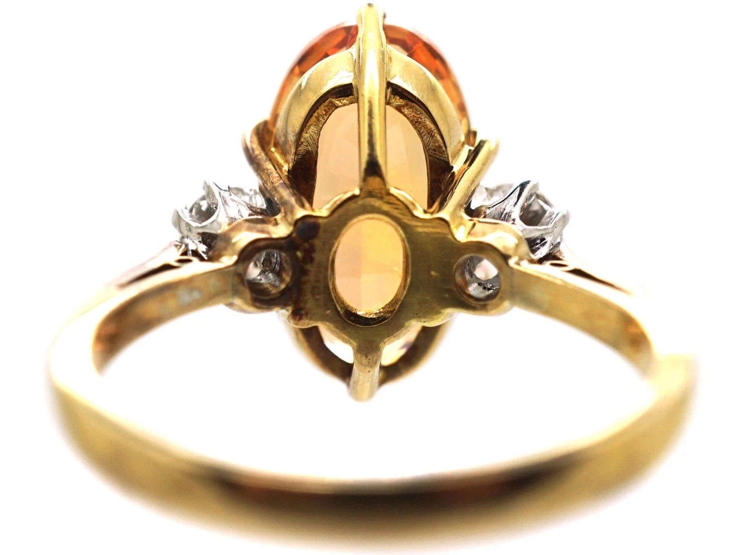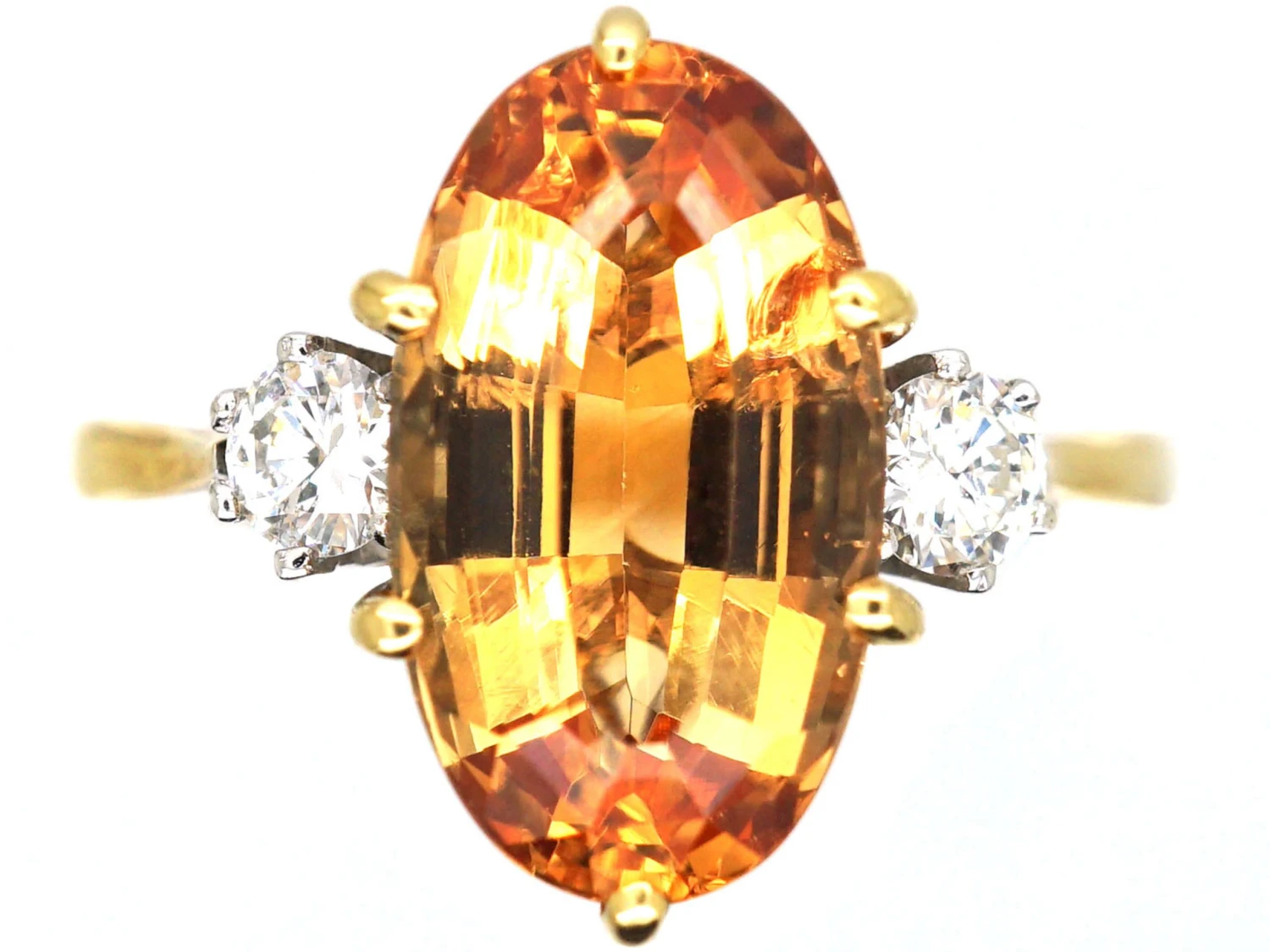 A wonderful 18ct75% pure gold (or 750 parts pure gold and 250 parts other metals) gold ring that has been set with an Imperial topazIt comes in many colours, including brown, green. blue, yellow, red, pink and orange. Topaz is very hard, being 8 on the Mohs scale, with a high cleavage. that weighs over four caratsThe unit of weight for a diamond or other gemstone and also for a pearl. Abbreviated ‘ct’, 1 carat is equal to 0.2 grams. In reference to gold, a unit of purity or fineness of gold and gold alloy, expressed as a number out of 24 parts by weight, e.g. ’24 carat’ signifies pure gold, ’18 carat’ 18/24th gold in the alloy, et cetera. Also abbreviated as ‘c…. Topaz is very sought after and is quite a rare stone and totally different to a citrineCitrine (from the French for ‘lemon’) is a rare, yellow type of quartz, a semi-precious stone that ranges in colour from pale yellow to orange to golden brown. The best quality citrine is found in Brazil.. The name imperial topaz is said to have originated in 19th century Russia, where the Ural Mountain mines were an important source of topaz reportedly reserved for the royal family. The warm orange of the stone goes beautifully with the colour of the gold. The low ornate claw settingsA series of precious metal prongs, or “claws”, designed to hold a gemstone securely in place whilst allowing maximum light to reach it. give this ring a simple elegance and the bright white diamonds on either side compliment the topaz beautifully. It looks so pretty when worn.