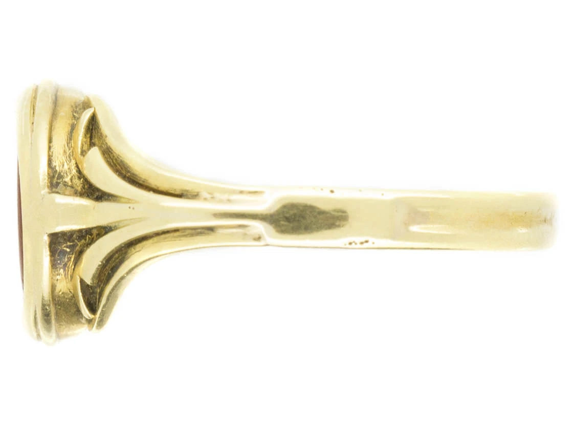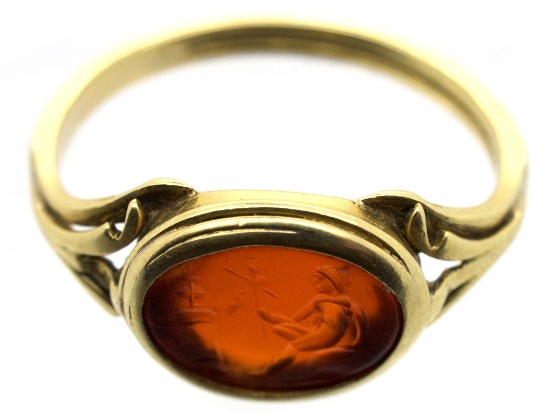A large GeorgianJewellery made in the Georgian era (1714-1830). 18ct75% pure gold (or 750 parts pure gold and 250 parts other metals) gold ring containing a Roman Carnelian​A translucent red variety of chalcedony which in its turn is a form of cryptocrystalline quartz. ​Carnelian has​ been known and used since antiquity when it was sourced from the surfaces of the Egyptian and Arabian deserts. The ​most prized carnelian has a true blood-red color. intaglioAn engraved stone, the opposite of a cameo, with a recessed design cut below the surface of the stone. Intaglio designs are common for signet rings and fob seals. of a man with a flaming spear. An unusual subject and in good condition.
