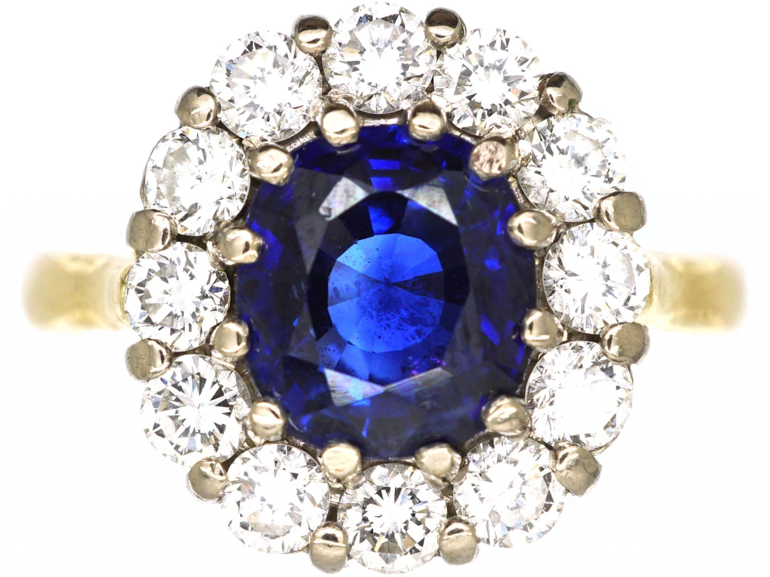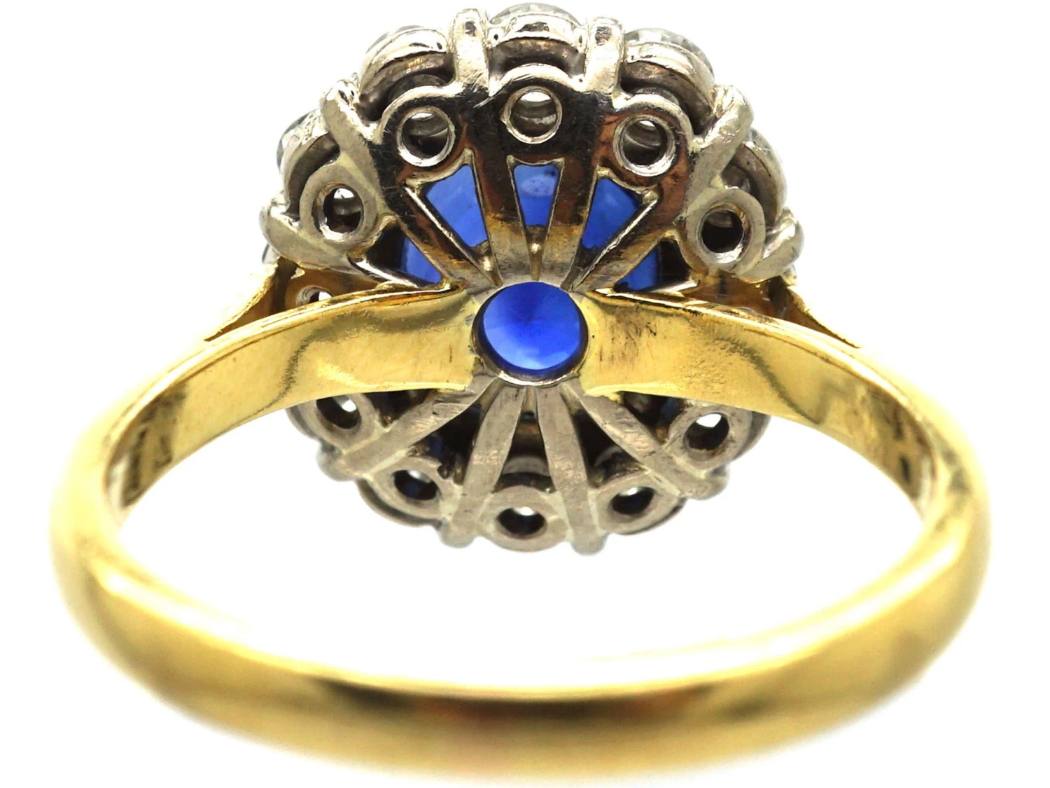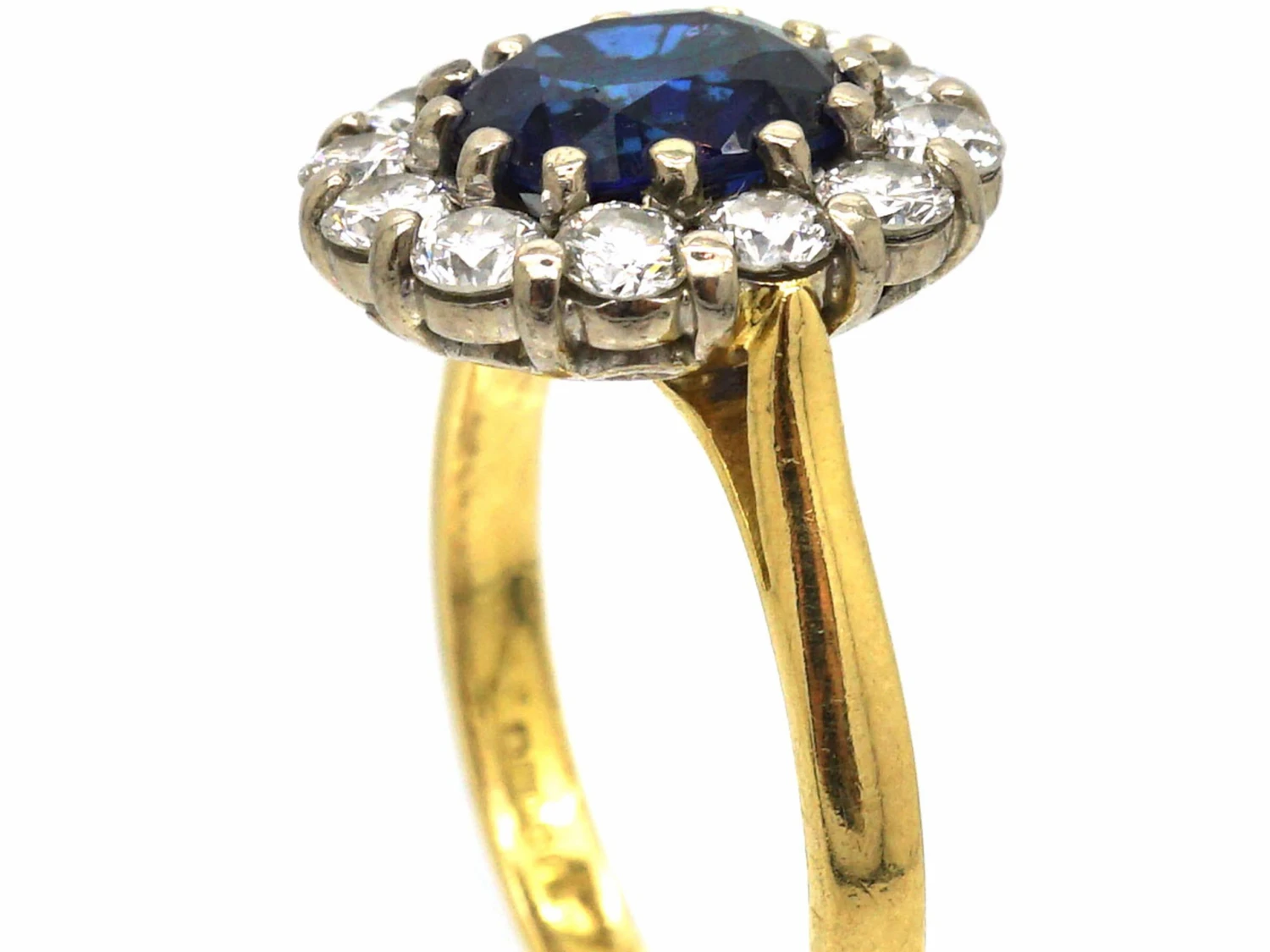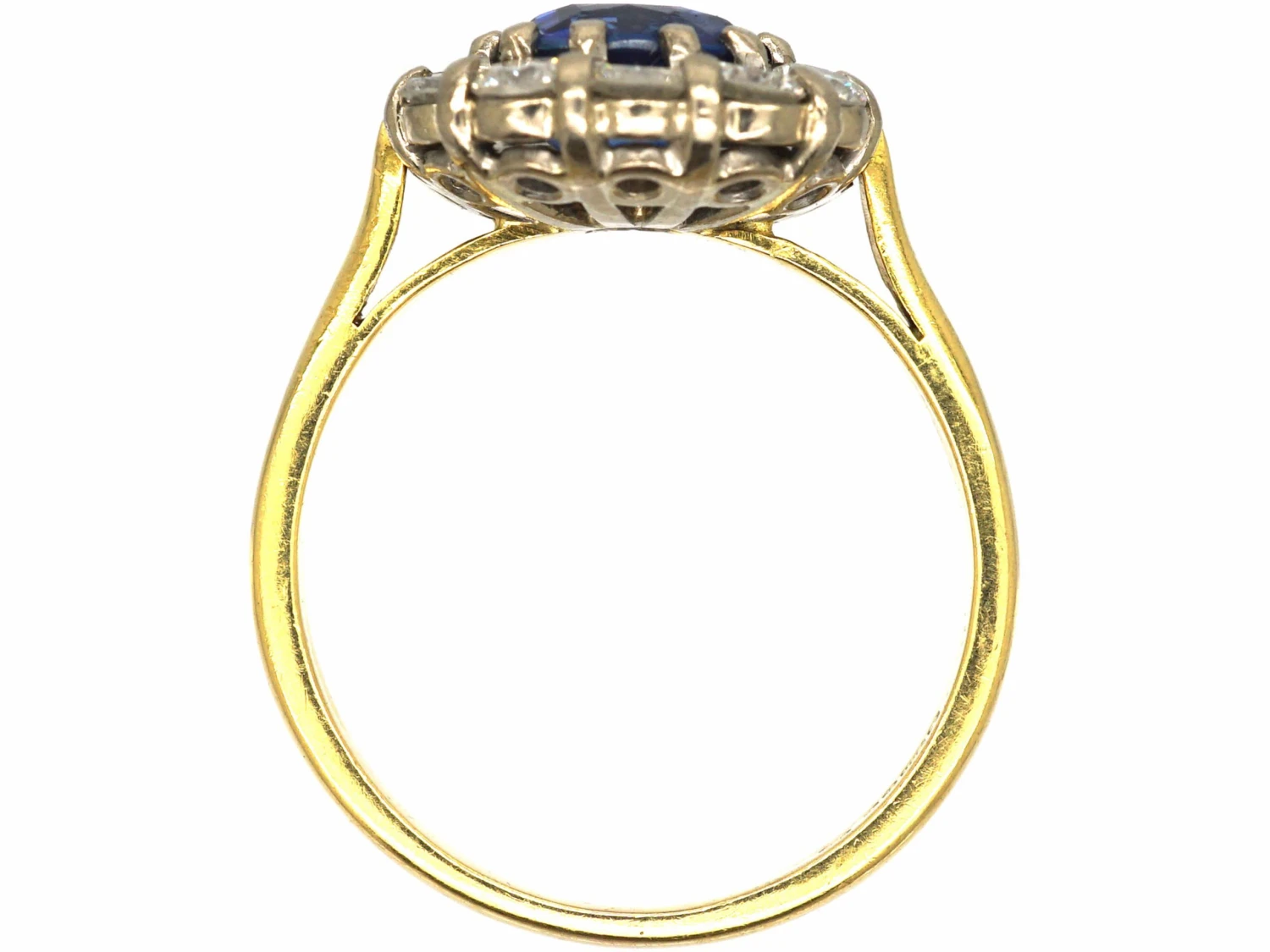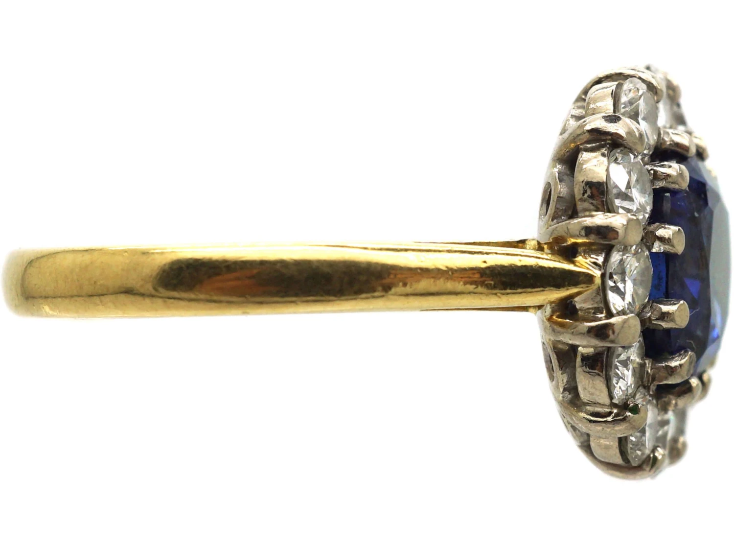 is a wonderful Royal blue colour and is surrounded by twelve evenly matched good bright white diamonds. It sits low on the finger so it is a practical ring to wear on a daily basis.