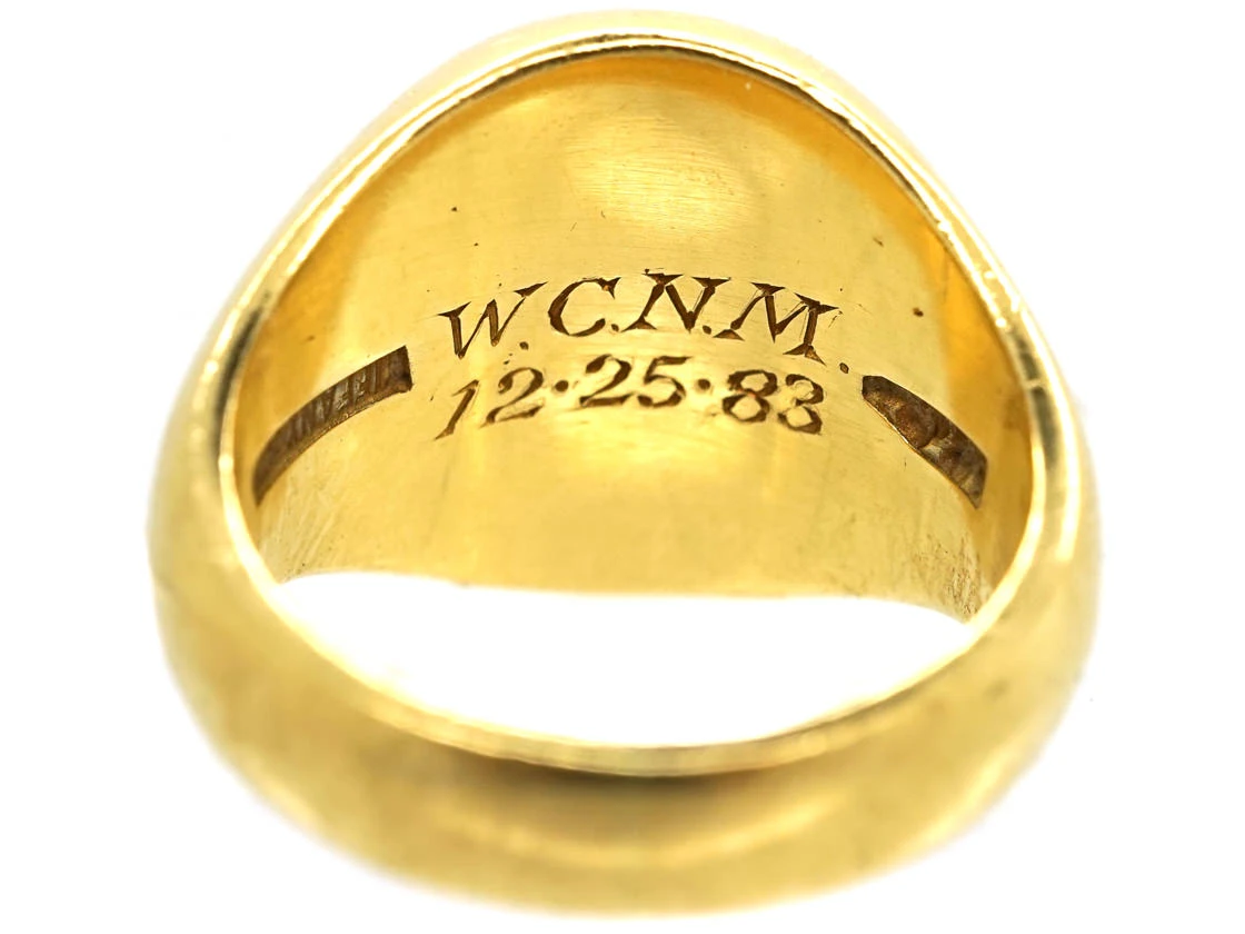 A good heavy 18ct75% pure gold (or 750 parts pure gold and 250 parts other metals) gold ring retailed by Tiffany in 1983. It has a Ducal crest with a tiger’s head above a coronet and shield and the latin word “Vigilo”, meaning “Be vigilant or watchful “.