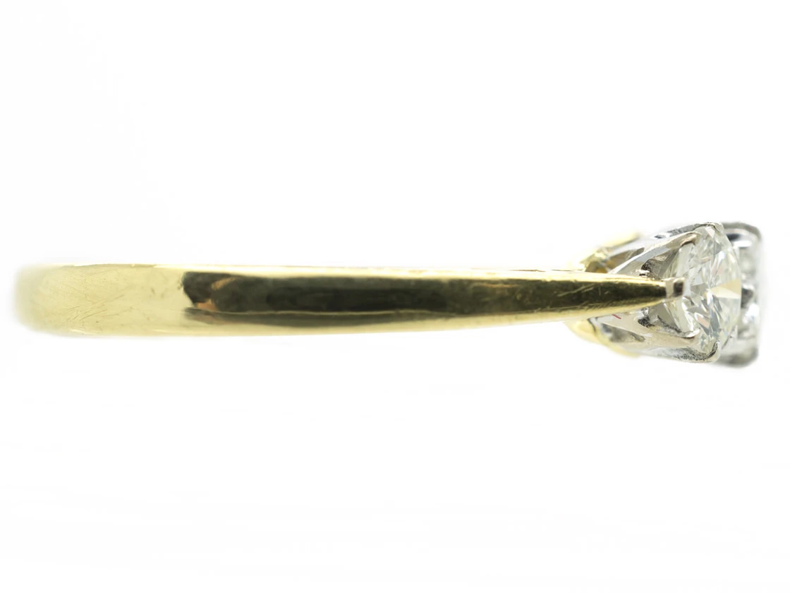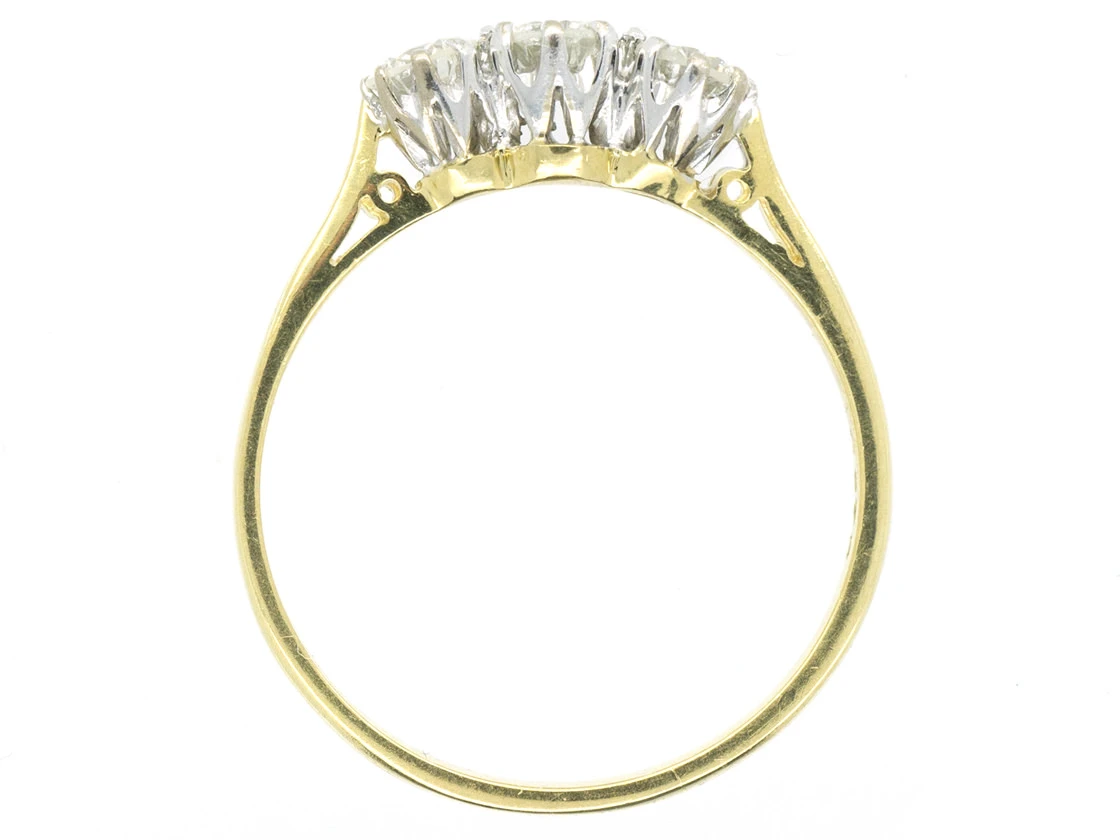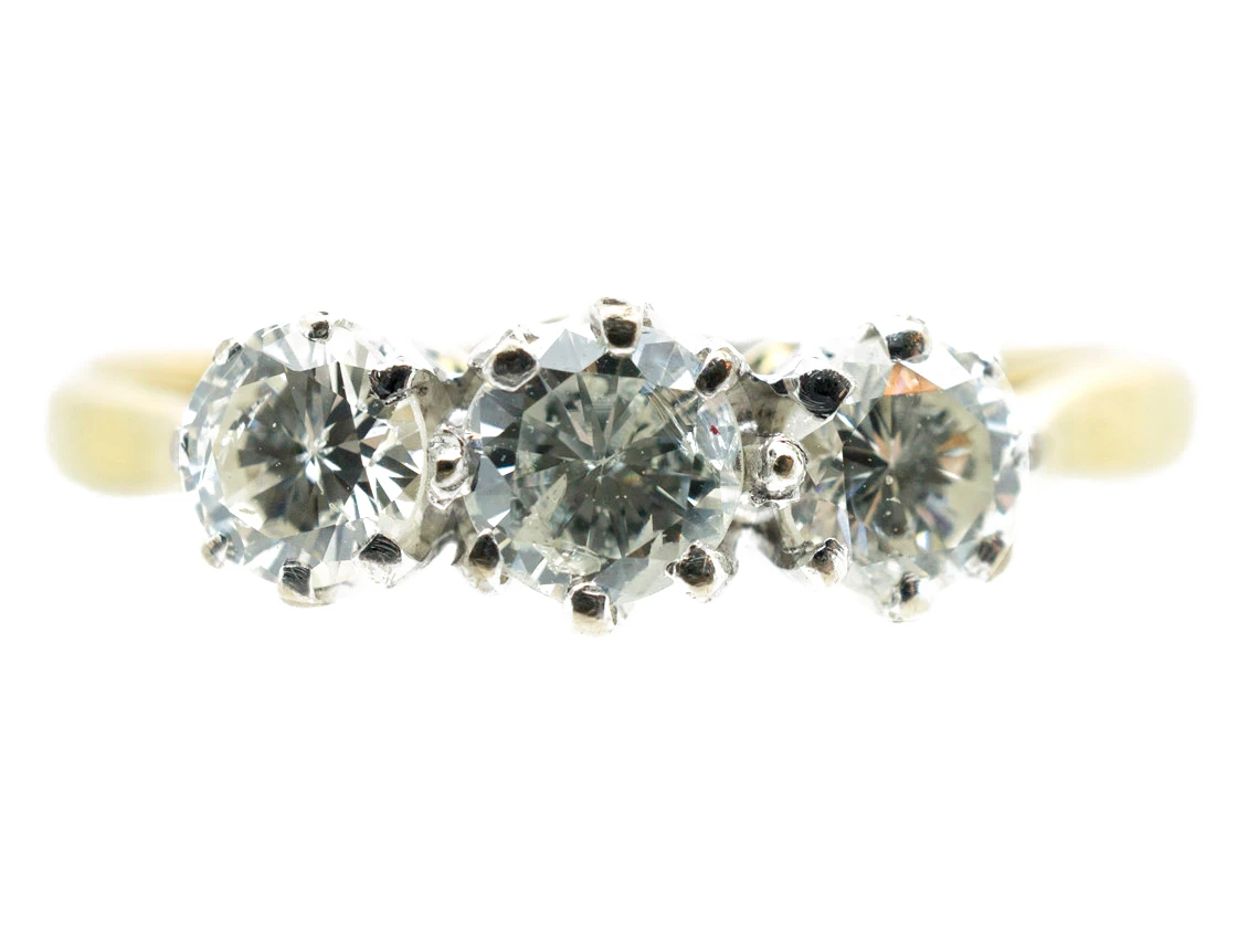 A good quality three stone diamondA precious, lustrous gemstone made of highly compressed carbon. Diamonds are one of the hardest materials known to mankind. Colours of diamonds range from colourless, yellow, orange and brown to almost black. Natural coloured (or ‘fancy’) diamonds can be extremely rare. The cut, colour, clarity and carat weight of a diamond are the criteria jewellers use… ring. The diamonds are very well matched bright stones and have a combined total weight of 85 pointsA unit of weight for a diamond, being one-hundredth of a metric carat. It is used for weights that are decimal fractions of a carat, and all figures after the second decimal point are, in the diamond and jewellery trade, generally discarded.. It would be ideal as an engagement ring.