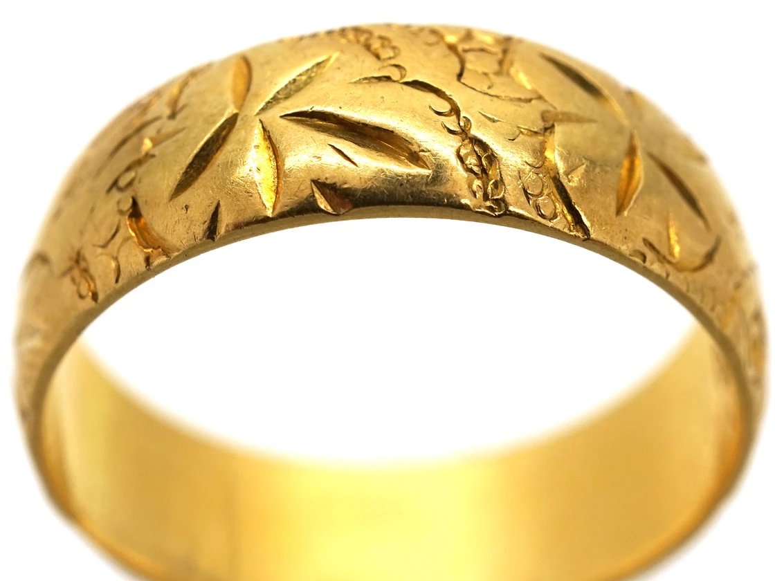 This 18ct75% pure gold (or 750 parts pure gold and 250 parts other metals) gold wedding ring was made in 1994 by the well known firm Charles Green & Sons. It is a pretty design with rose and ivy decoration for “True love” and “Cling to me”.