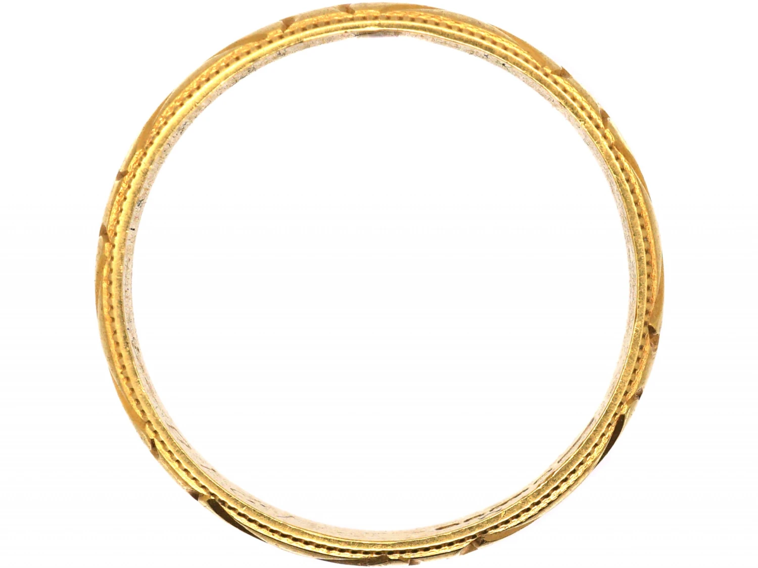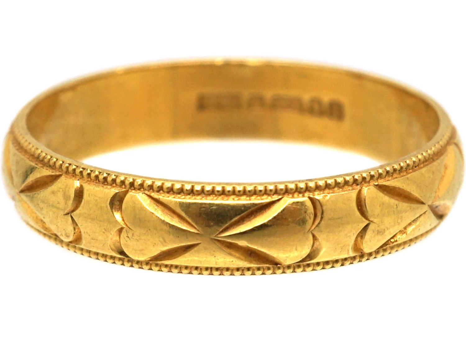 An 18ct75% pure gold (or 750 parts pure gold and 250 parts other metals) gold wedding ring that was made in London in 1990. The lovely thing about this ring are the hearts that face each other and go all around the shankThe circle of metal that attaches to the decorative part of a ring and encircles the finger.. A lovely design that will carry you through!