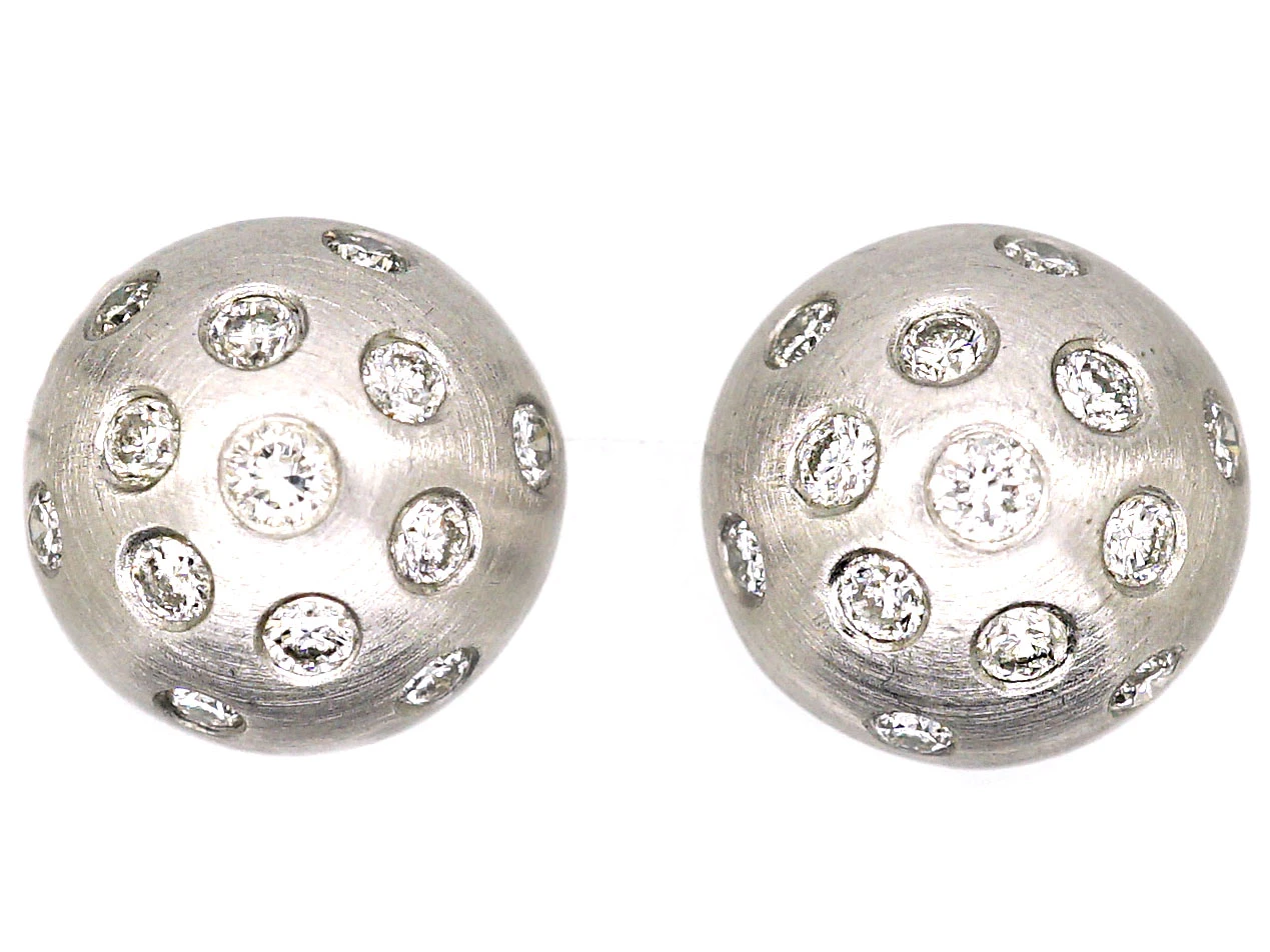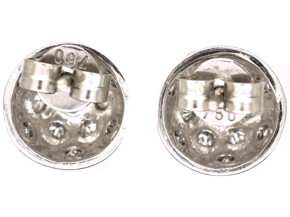 These 18ct75% pure gold (or 750 parts pure gold and 250 parts other metals) white goldWhite gold is an alloy of gold and at least one other white metal – most often nickel or palladium (both of which act as a bleaching agent to reduce the natural yellow colour of the gold). earrings are wearable day and night. They are a lovely bombéThe term bombé (from the French for bomb or rounded like a bomb) refers to a rounded or dome shape in jewellery design. Generally, the item is rounded on the top with bulged or pushed-out sides and a plump outline. Bombé styling has been popular for rings and earrings throughout the twentieth century. shape and have been rub over set with small diamonds.