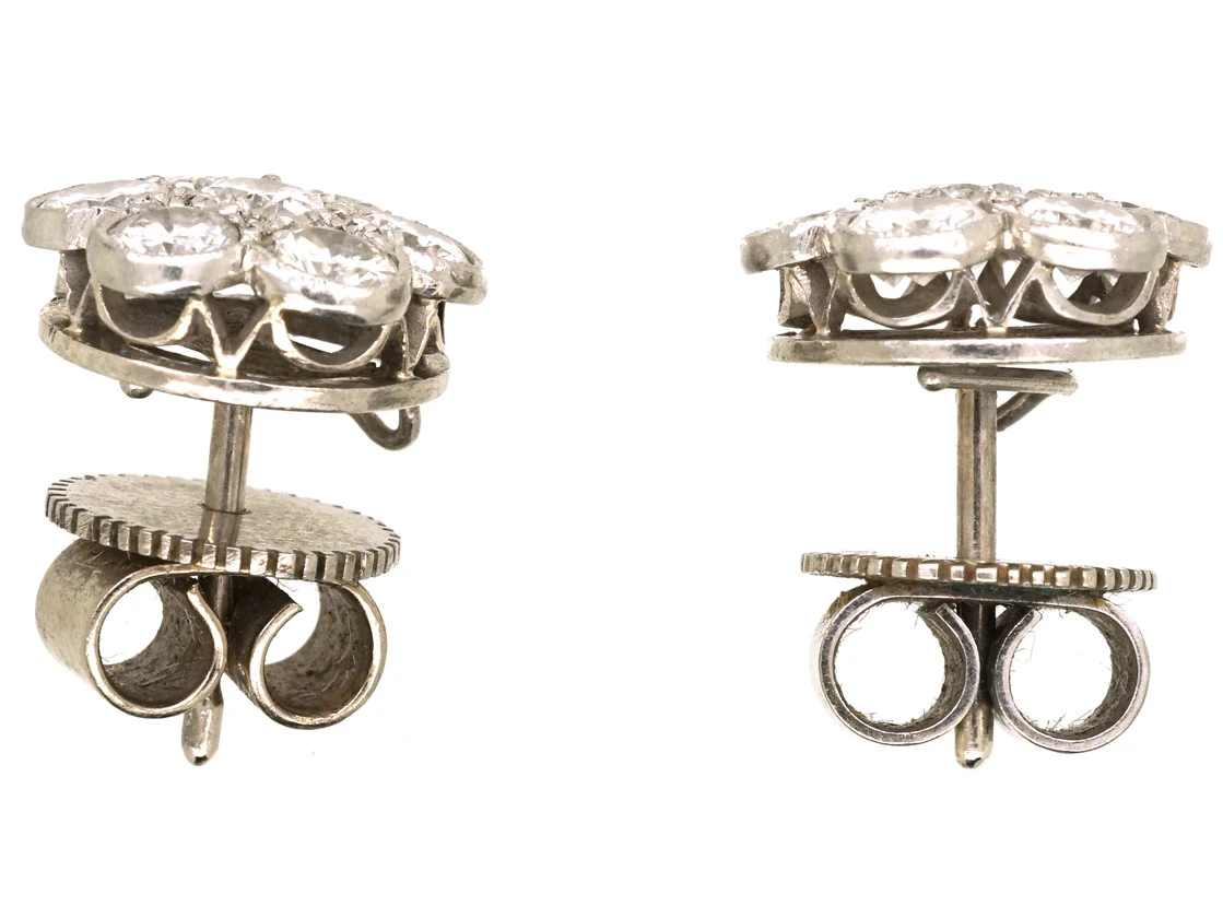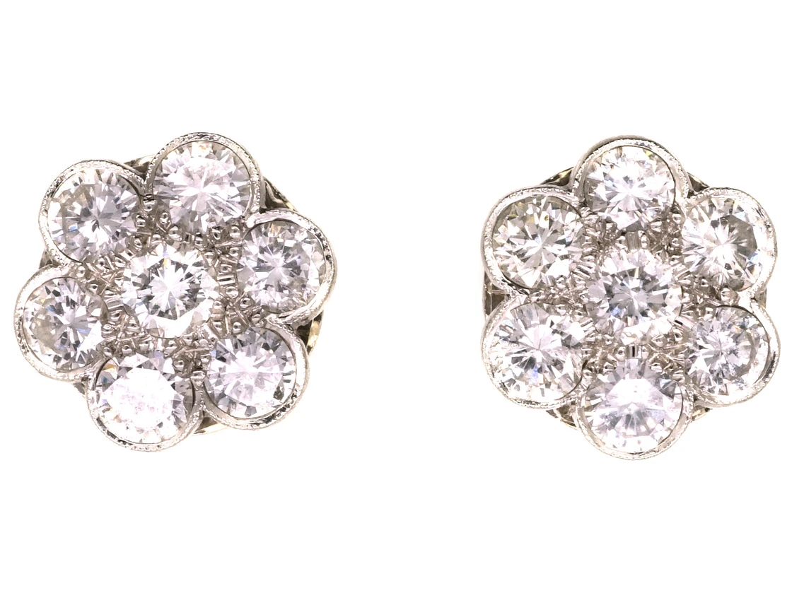 A good pair of 18ct75% pure gold (or 750 parts pure gold and 250 parts other metals) white goldWhite gold is an alloy of gold and at least one other white metal – most often nickel or palladium (both of which act as a bleaching agent to reduce the natural yellow colour of the gold). clusterA group of small diamonds or colourful gemstones grouped together to form a cluster, mimicking the look of a larger gem. Often this group can surround a larger center stone. earrings. They have a total weight of over two caratsThe unit of weight for a diamond or other gemstone and also for a pearl. Abbreviated ‘ct’, 1 carat is equal to 0.2 grams. In reference to gold, a unit of purity or fineness of gold and gold alloy, expressed as a number out of 24 parts by weight, e.g. ’24 carat’ signifies pure gold, ’18 carat’ 18/24th gold in the alloy, et cetera. Also abbreviated as ‘c… and are well matched clear white diamonds. There is a flat hook on the reverse that can be used to create a drop of either a pearlNatural pearls are an organic gem formed inside live mollusc shells and come in all shapes and sizes. They are formed as the result of a natural irritant within the mollusc’s mantle and as a defence, layers of iridescent nacre form over the top of it, creating a pearl. or some other stone if wished.