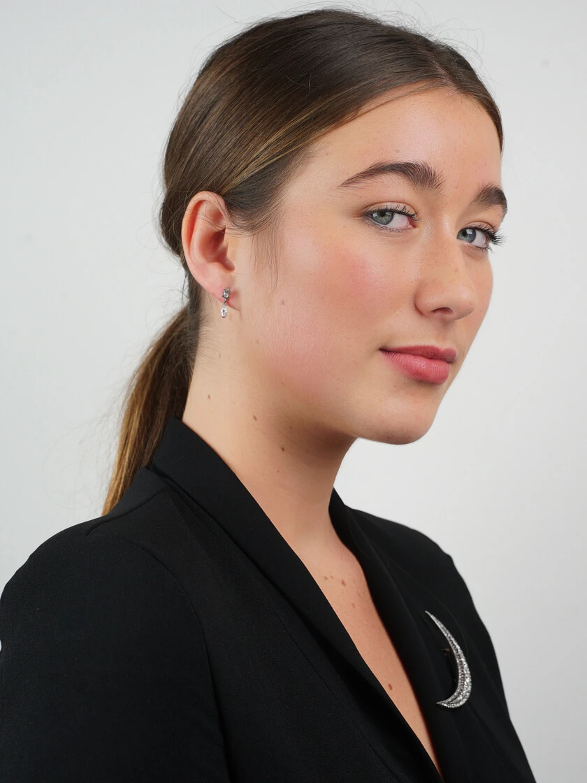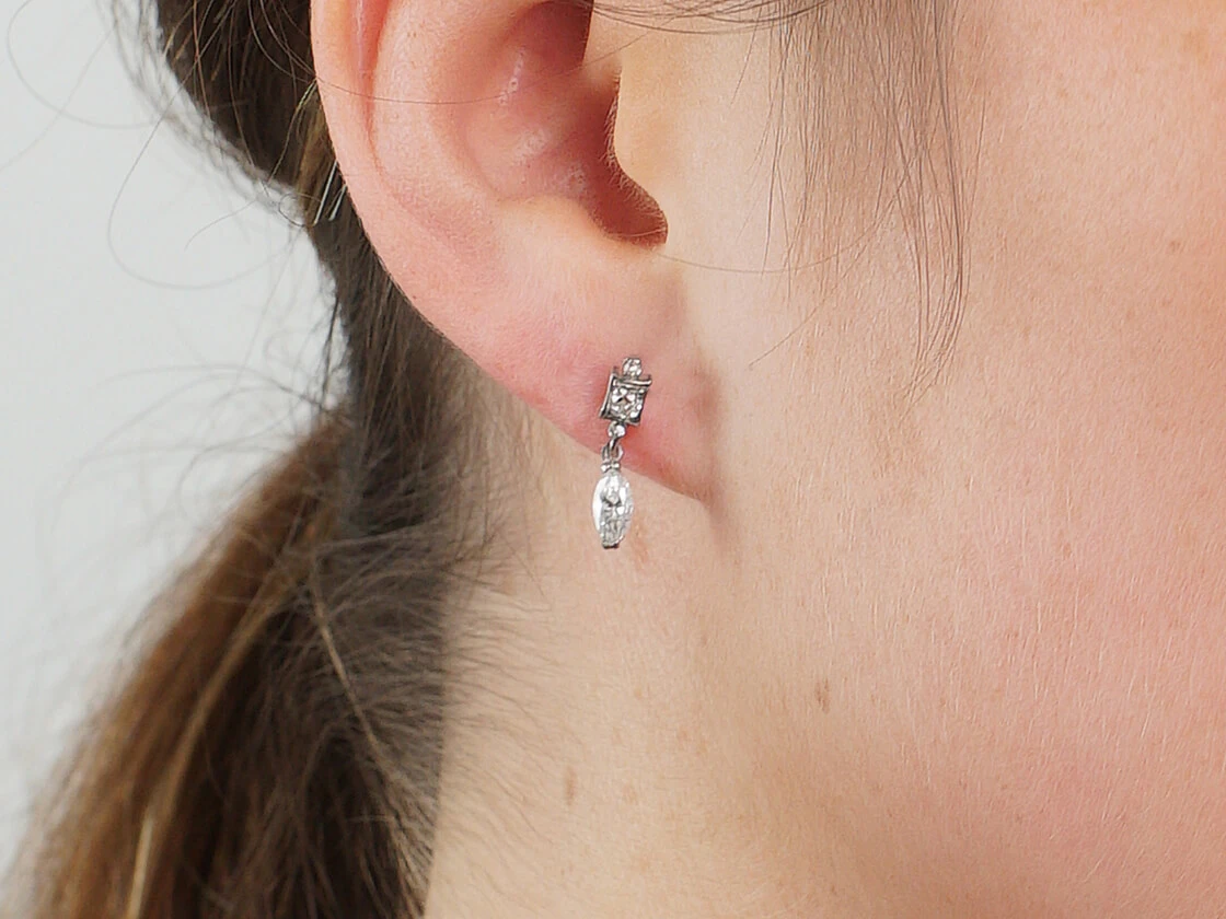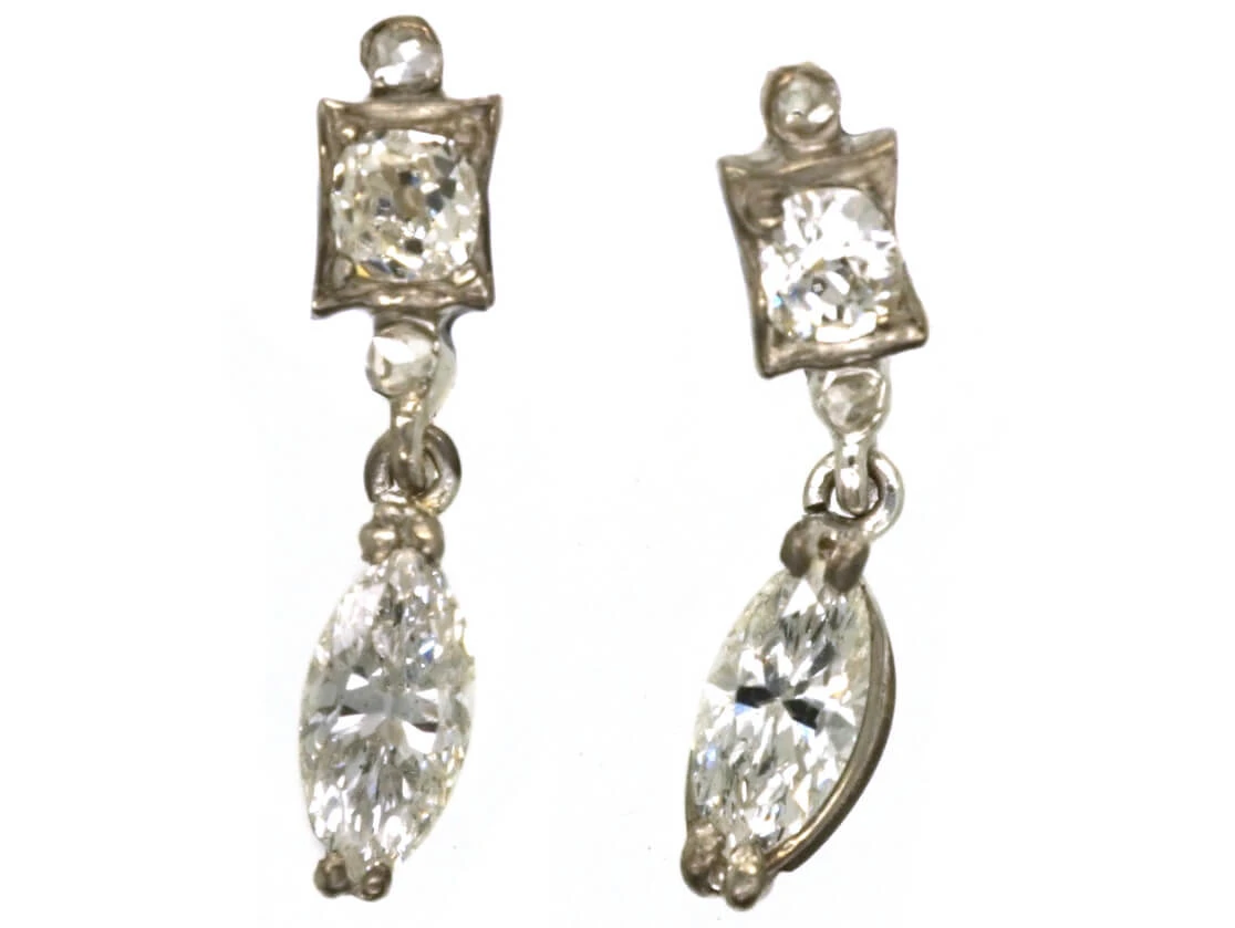 A pretty pair of diamondA precious, lustrous gemstone made of highly compressed carbon. Diamonds are one of the hardest materials known to mankind. Colours of diamonds range from colourless, yellow, orange and brown to almost black. Natural coloured (or ‘fancy’) diamonds can be extremely rare. The cut, colour, clarity and carat weight of a diamond are the criteria jewellers use… drop earrings which have two 25 pointA unit of weight for a diamond, being one-hundredth of a metric carat. It is used for weights that are decimal fractions of a carat, and all figures after the second decimal point are, in the diamond and jewellery trade, generally discarded. marquiseAn oval or elliptical gemstone cut which has pointed ends. Also called a Navette shape. shaped diamonds surmounted by a round diamond in a square setting with a tiny diamond above. They would be ideal for a bride.