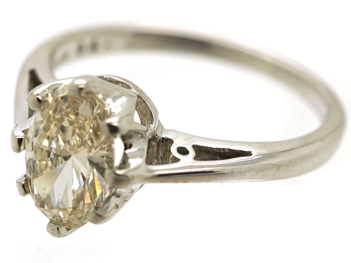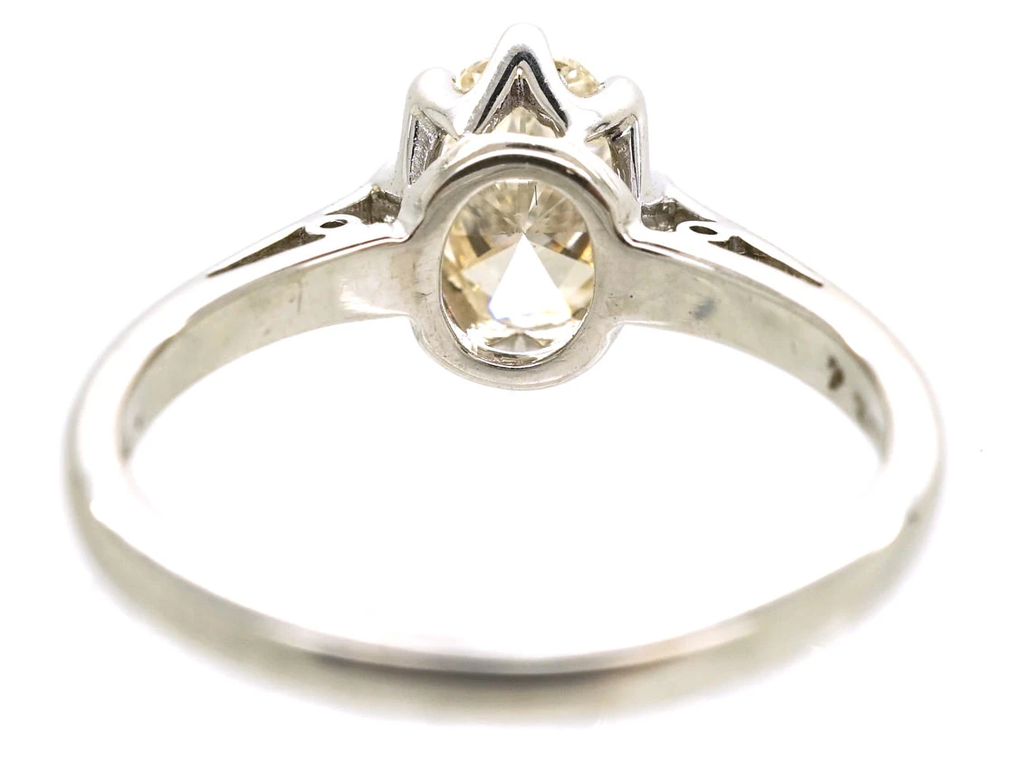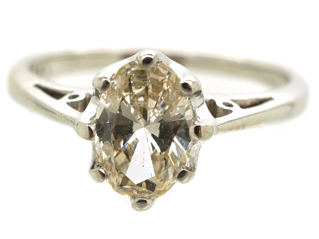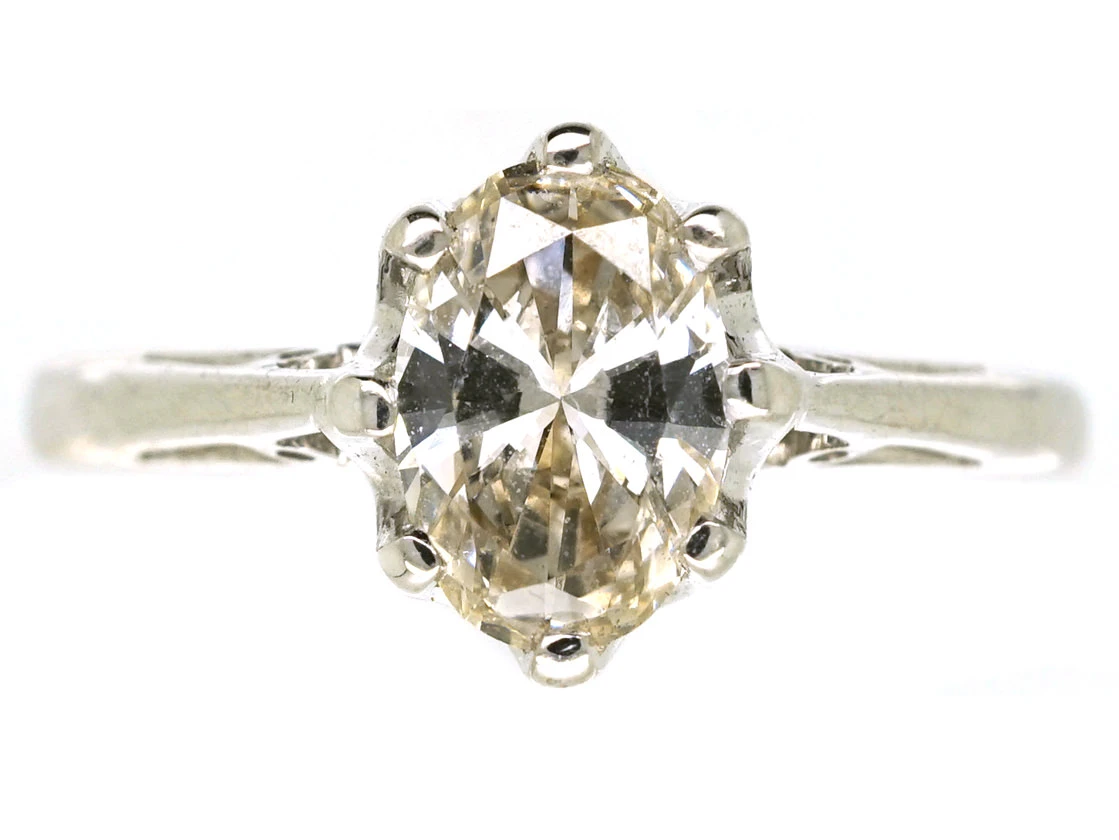 A smart 18ct75% pure gold (or 750 parts pure gold and 250 parts other metals) white goldWhite gold is an alloy of gold and at least one other white metal – most often nickel or palladium (both of which act as a bleaching agent to reduce the natural yellow colour of the gold). ring set with an oval shaped diamondA precious, lustrous gemstone made of highly compressed carbon. Diamonds are one of the hardest materials known to mankind. Colours of diamonds range from colourless, yellow, orange and brown to almost black. Natural coloured (or ‘fancy’) diamonds can be extremely rare. The cut, colour, clarity and carat weight of a diamond are the criteria jewellers use…. The diamond weighs three quarters of a caratThe unit of weight for a diamond or other gemstone and also for a pearl. Abbreviated ‘ct’, 1 carat is equal to 0.2 grams. In reference to gold, a unit of purity or fineness of gold and gold alloy, expressed as a number out of 24 parts by weight, e.g. ’24 carat’ signifies pure gold, ’18 carat’ 18/24th gold in the alloy, et cetera. Also abbreviated as ‘c… which is quite a good size and is a good bright white stone. It would make an ideal engagement ring.