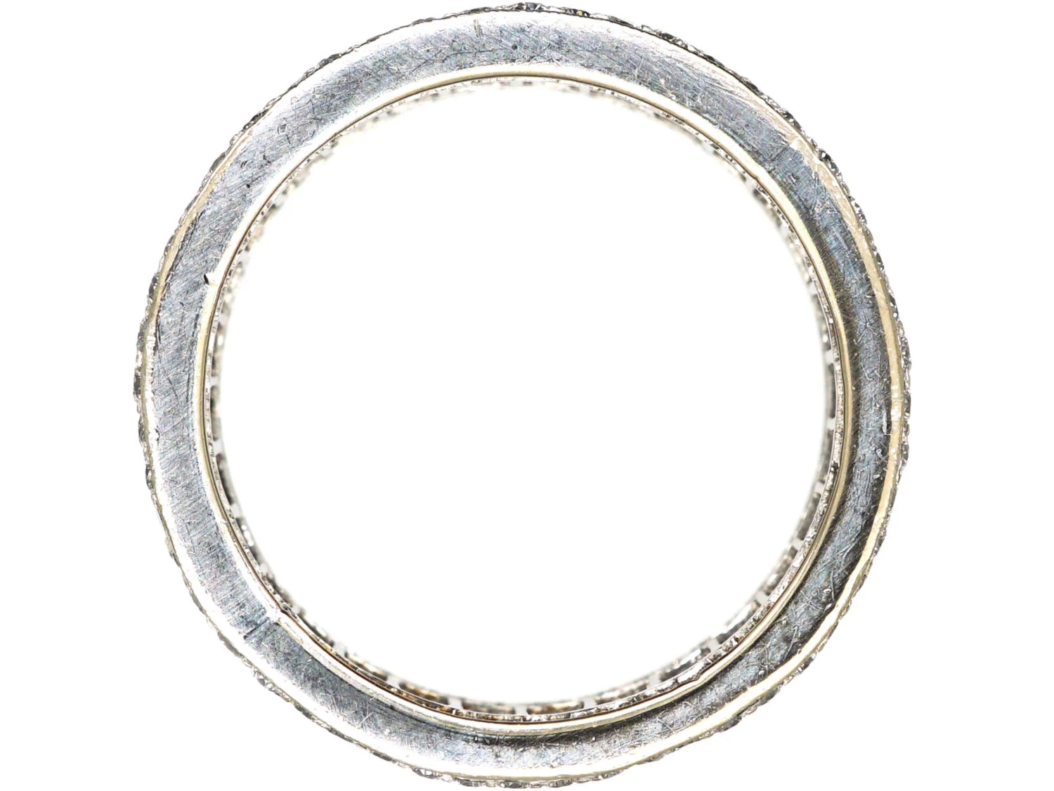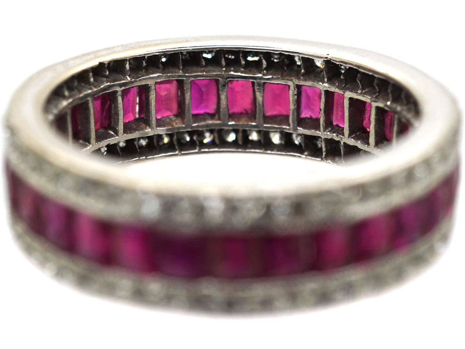 A lovely 18ct75% pure gold (or 750 parts pure gold and 250 parts other metals) white goldWhite gold is an alloy of gold and at least one other white metal – most often nickel or palladium (both of which act as a bleaching agent to reduce the natural yellow colour of the gold). ring that has been tramline set with Princess cut rubies. The Princess cut is a square cut with a flat top and pointed corners which is an attractive look. On either side of the rubies is a line of well matched good bright white diamonds. There is millegrainA tiny decorative feature – normally in platiunum – in which minute beads of metal are raised along the edge of a setting, which adds texture and enhances the sparkling effect. detail throughout. This ring cannot be sized.