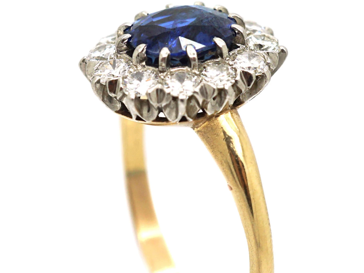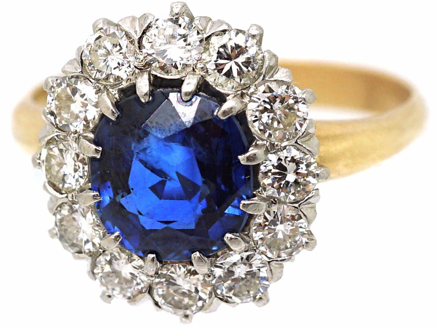 that is most likely from CeylonSri Lankan (Ceylon was the country’s former name until 1972) (Sri Lanka) and weighs over two caratsThe unit of weight for a diamond or other gemstone and also for a pearl. Abbreviated ‘ct’, 1 carat is equal to 0.2 grams. In reference to gold, a unit of purity or fineness of gold and gold alloy, expressed as a number out of 24 parts by weight, e.g. ’24 carat’ signifies pure gold, ’18 carat’ 18/24th gold in the alloy, et cetera. Also abbreviated as ‘c…. Around it are twelve well matched good white diamonds that weigh just under one caratThe unit of weight for a diamond or other gemstone and also for a pearl. Abbreviated ‘ct’, 1 carat is equal to 0.2 grams. In reference to gold, a unit of purity or fineness of gold and gold alloy, expressed as a number out of 24 parts by weight, e.g. ’24 carat’ signifies pure gold, ’18 carat’ 18/24th gold in the alloy, et cetera. Also abbreviated as ‘c…. It sits low on the finger so it is a practical ring to wear as an engagement ring.