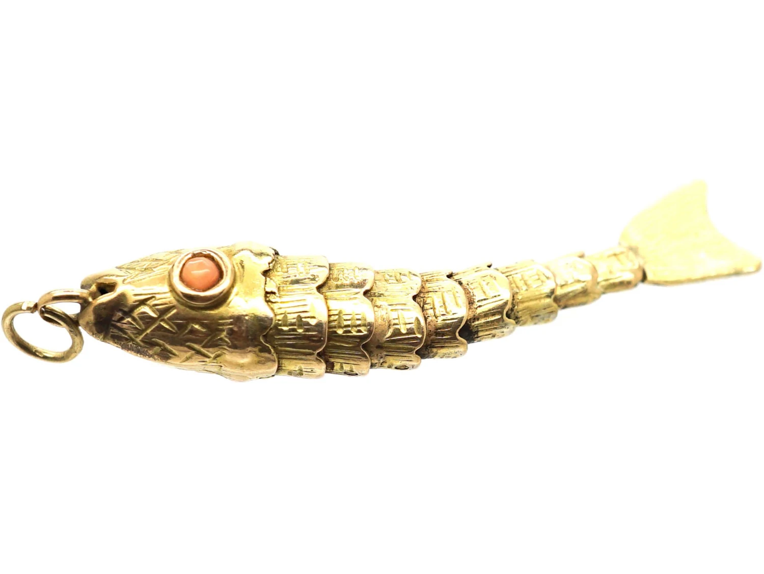 A fun pendant that articulates or wriggles beautifully when worn. It is 9ct37.5% pure gold (or 375 parts pure gold and 625 parts other metals) gold and has small cabochonA polished, not faceted, dome shaped stone – either round or oval with a flat polished base, primarily used as a cut for phenomenal stones such as cat’s eyes and stars.