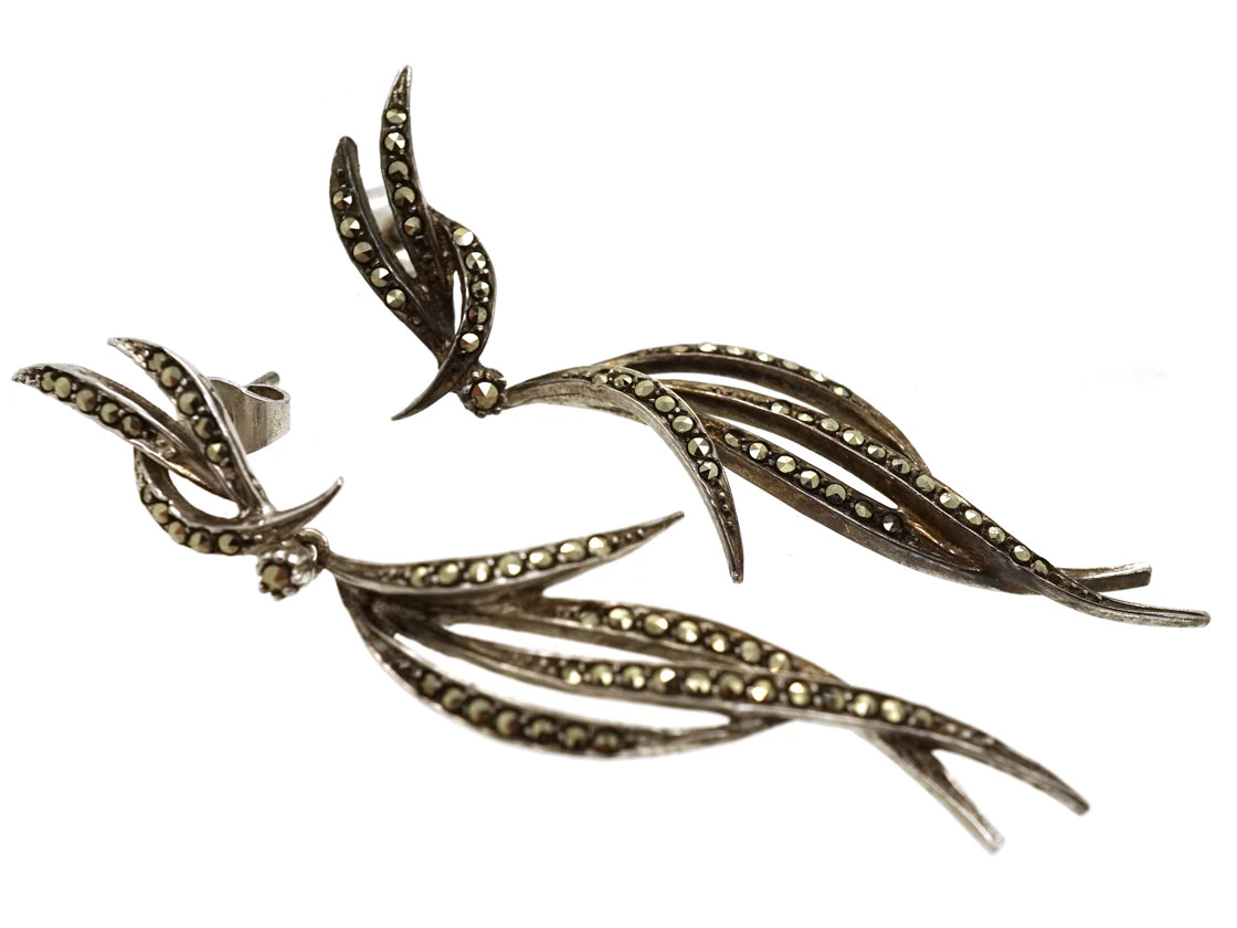 and marcasiteThe marcasite of jewellery is in fact iron pyrite as marcasite itself is too brittle alone for the durability required of a piece. This jewellery marcasite is sometimes called ‘fool’s gold’ given its heavily metallic appearance. Marcasite of this kind also offers a kind of iridescence, explaining its use as a more affordable diamond replacement that wi… drop earrings. Marcasite is the trade name for iron pyrites which were used in costume jewelleryJewellery designed for wear with current fashions and usually made of inexpensive materials. Usually applied to two classes of jewellery: gem-set imitations, which resemble precious jewellery but are made of silver (sometimes rhodium-coated) or pinchbeck and set with substitutes for gemstones, e.g. marcasite, paste or synthetic gemstones; although usually th… to imitate rose diamonds. They were made in the 1950s.