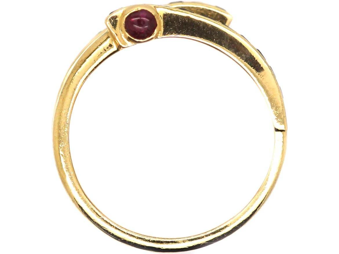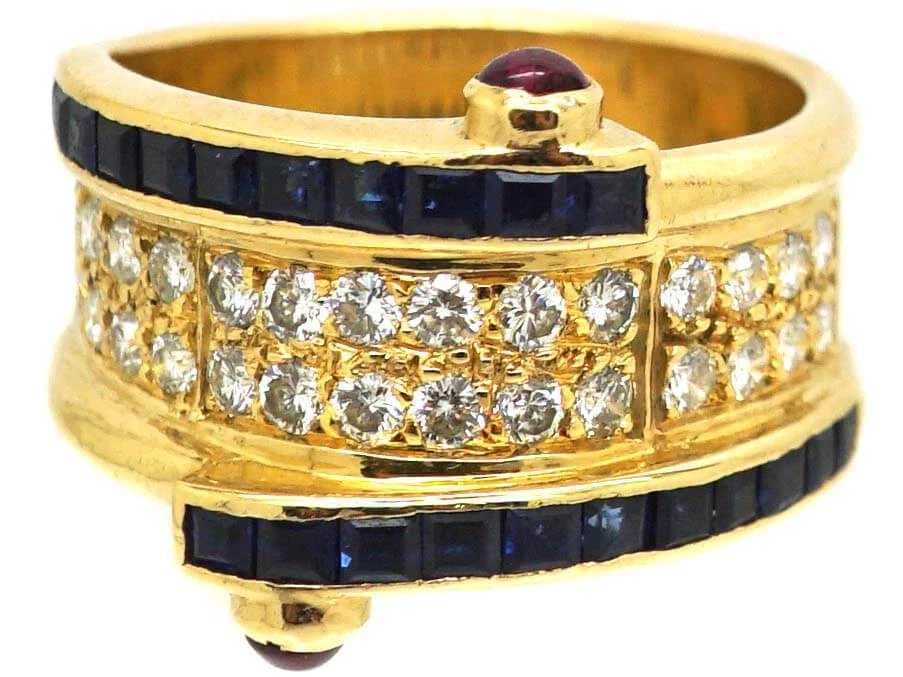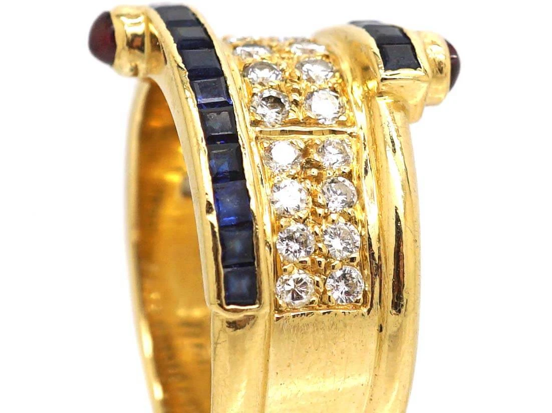 A very stylish 18ct gold ring that was made by the well known firm Boucheron circa 1970. It is composed of two lines of diamonds in three sections. On either side in a spiral effect are calibre cut sapphires with a cabochon ruby on either side.