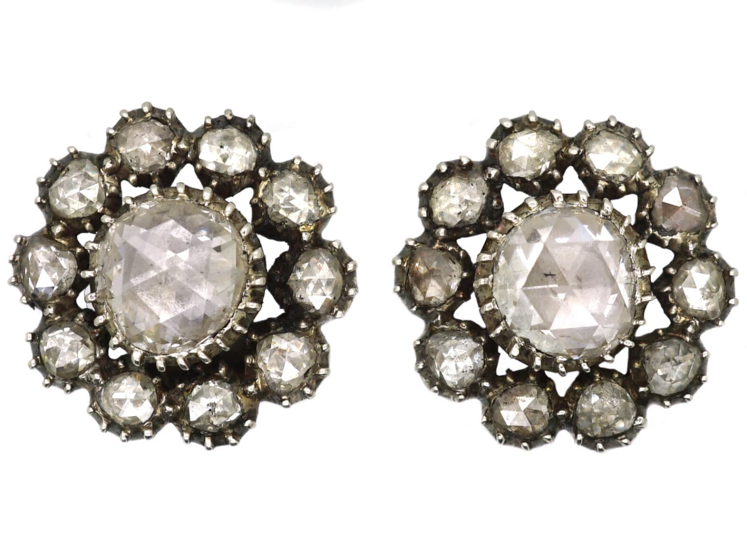 An impressive pair of rose diamondA precious, lustrous gemstone made of highly compressed carbon. Diamonds are one of the hardest materials known to mankind. Colours of diamonds range from colourless, yellow, orange and brown to almost black. Natural coloured (or ‘fancy’) diamonds can be extremely rare. The cut, colour, clarity and carat weight of a diamond are the criteria jewellers use… clusterA group of small diamonds or colourful gemstones grouped together to form a cluster, mimicking the look of a larger gem. Often this group can surround a larger center stone. earrings that were most likely made in Holland circa 1880. Each earring has been clawA precious metal prong used to hold a gemstone in place. set in silverA metallic element which is malleable and ductile, and white in colour, making it ideal for use in jewellery. It is usually mixed with copper to improve its hardness.