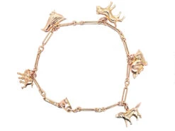 A sweet 1930s charm bracelet with flat charms that are much more comfortable on the wrist than bulky ones. Each charm is an animal, two dogs, two cats and a duck.