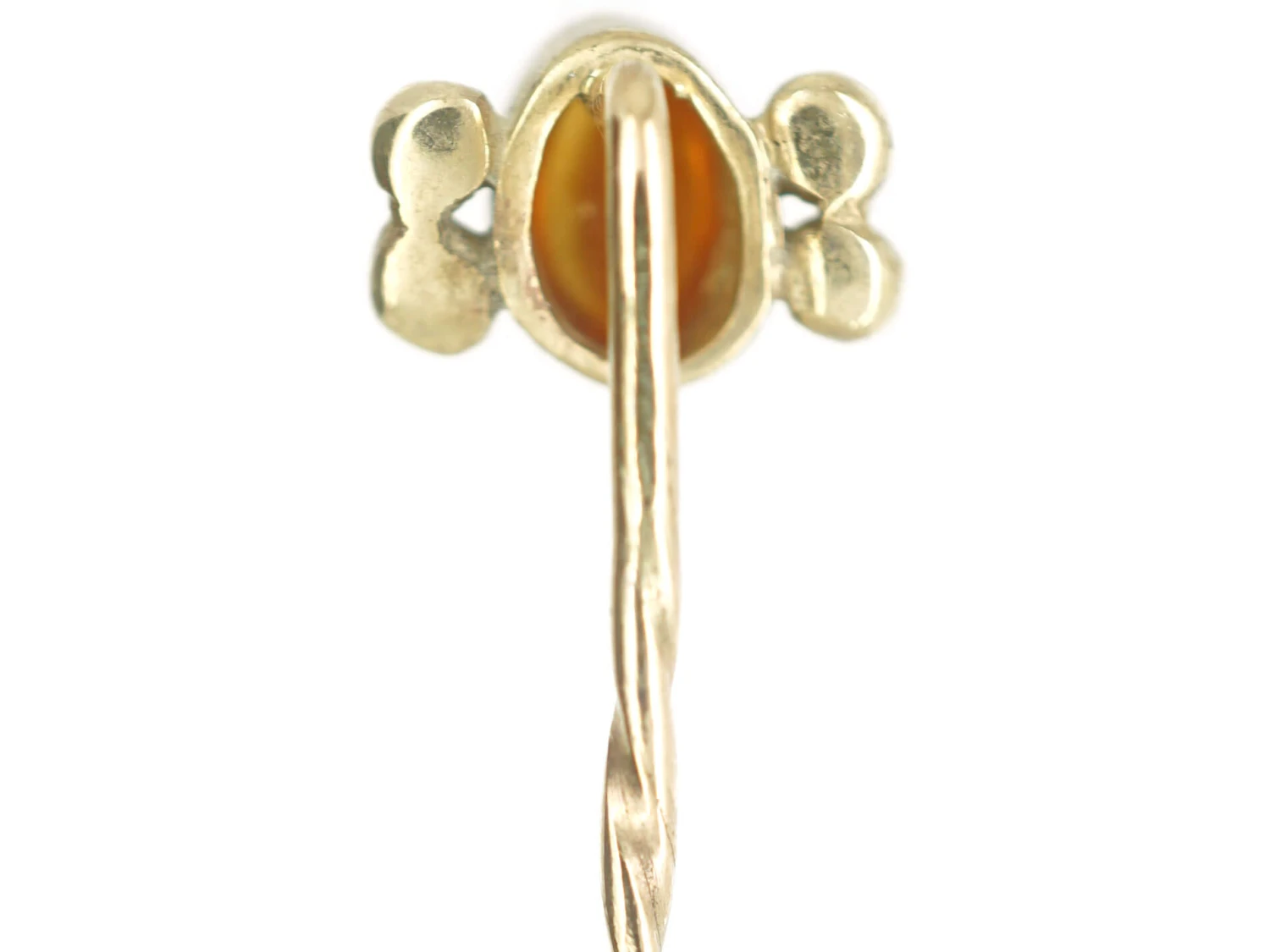 A good looking tie pin that has been set with a cabochonA polished, not faceted, dome shaped stone – either round or oval with a flat polished base, primarily used as a cut for phenomenal stones such as cat’s eyes and stars.