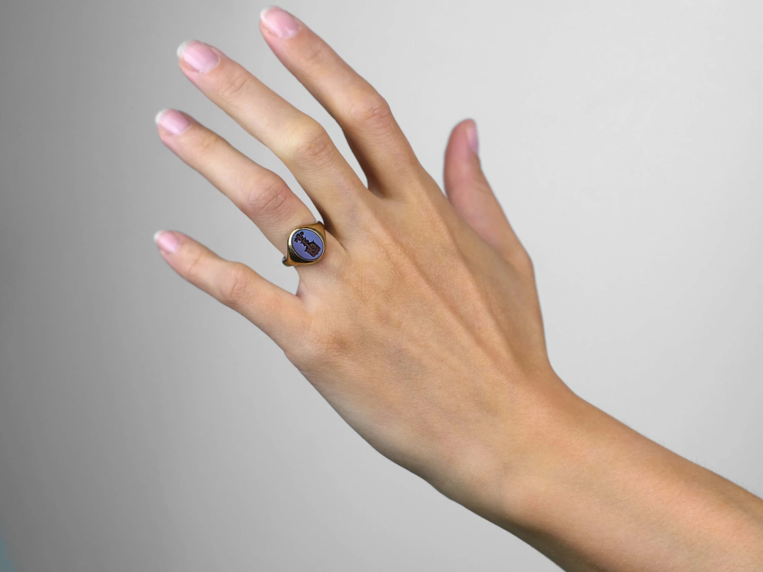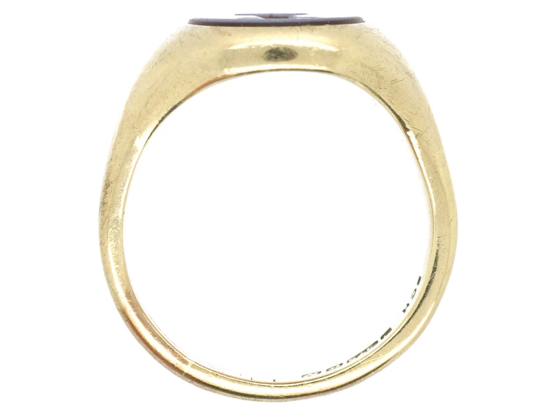 A smart 9ct37.5% pure gold (or 375 parts pure gold and 625 parts other metals) gold signet ringA ring with a central plaque on which one’s initials, a seal, or a crest is engraved. set with a carved carnelian​A translucent red variety of chalcedony which in its turn is a form of cryptocrystalline quartz. ​Carnelian has​ been known and used since antiquity when it was sourced from the surfaces of the Egyptian and Arabian deserts. The ​most prized carnelian has a true blood-red color. intaglioAn engraved stone, the opposite of a cameo, with a recessed design cut below the surface of the stone. Intaglio designs are common for signet rings and fob seals. of the Prince of Wales feathers above a coronet and Knight’s helmet. Below is a shield which has within a cross and a horn.