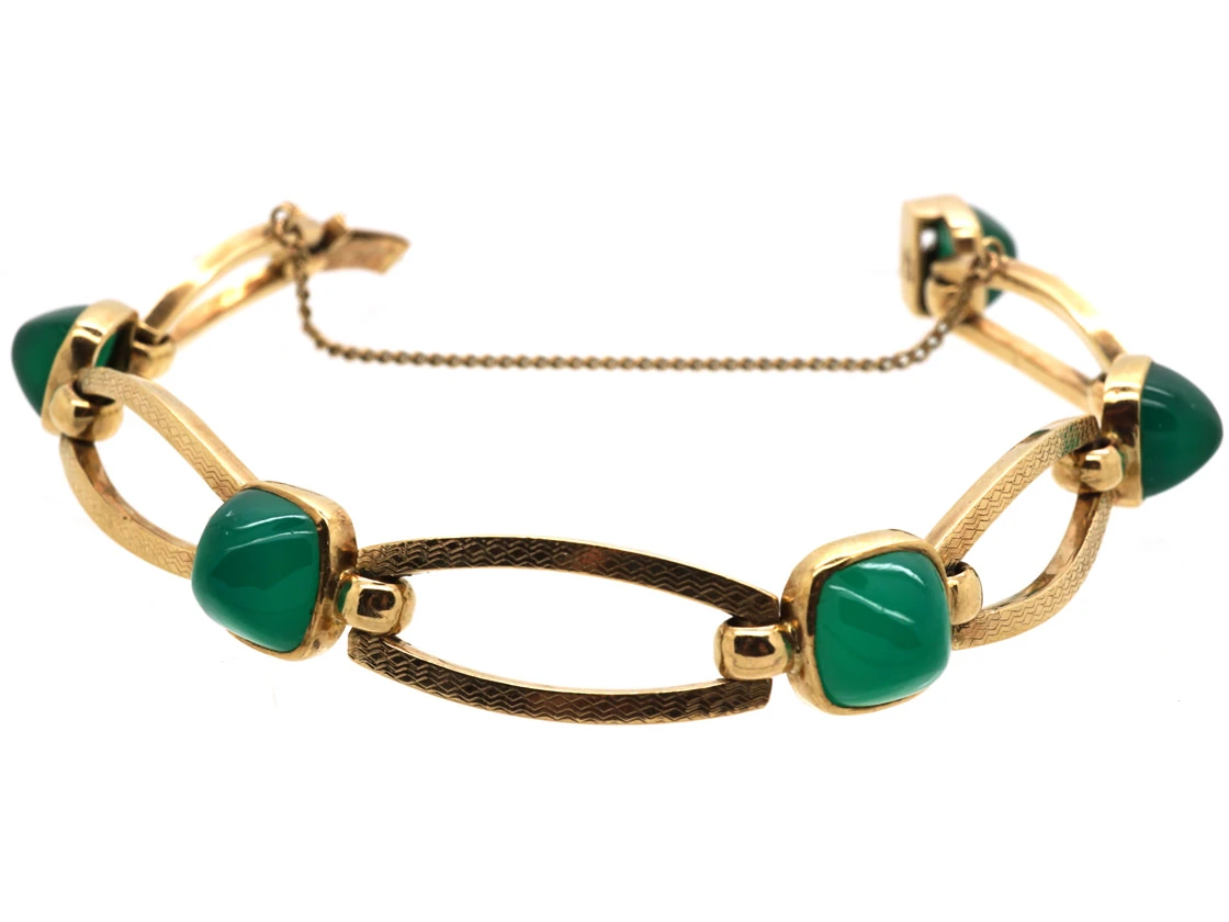 A well made and smart 9ct37.5% pure gold (or 375 parts pure gold and 625 parts other metals) gold bracelet by the firm Deakin & Francis. It was founded in 1786 by Benjamin Woolfield and is till in production today. It is one of the oldest jewellery firms left in England. Quality is paramount and this bracelet is no exception. It has been set with five carved green chalcedonyA microcrystalline type of quartz occurring in several different forms including onyx and agate. pieces within a gold framework and was made in the 1930s.