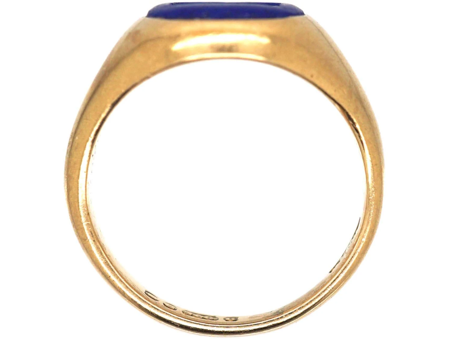 A smart 9ct37.5% pure gold (or 375 parts pure gold and 625 parts other metals) gold signet ringA ring with a central plaque on which one’s initials, a seal, or a crest is engraved. that has been set with a plaque of lapis lazuliAn historically popular deep blue opaque gemstone. Lapis Lazuli is chiefly composed of the mineral Lazurite and is often flecked with gold Pyrite, giving each stone a unique mysticism.. Lapis lazuli is a semi-precious gemstone, prized for its intense blue colour. It has an intaglioAn engraved stone, the opposite of a cameo, with a recessed design cut below the surface of the stone. Intaglio designs are common for signet rings and fob seals. crest of a cow and three crosses within a shield. This ring was made circa 1930-1940.
