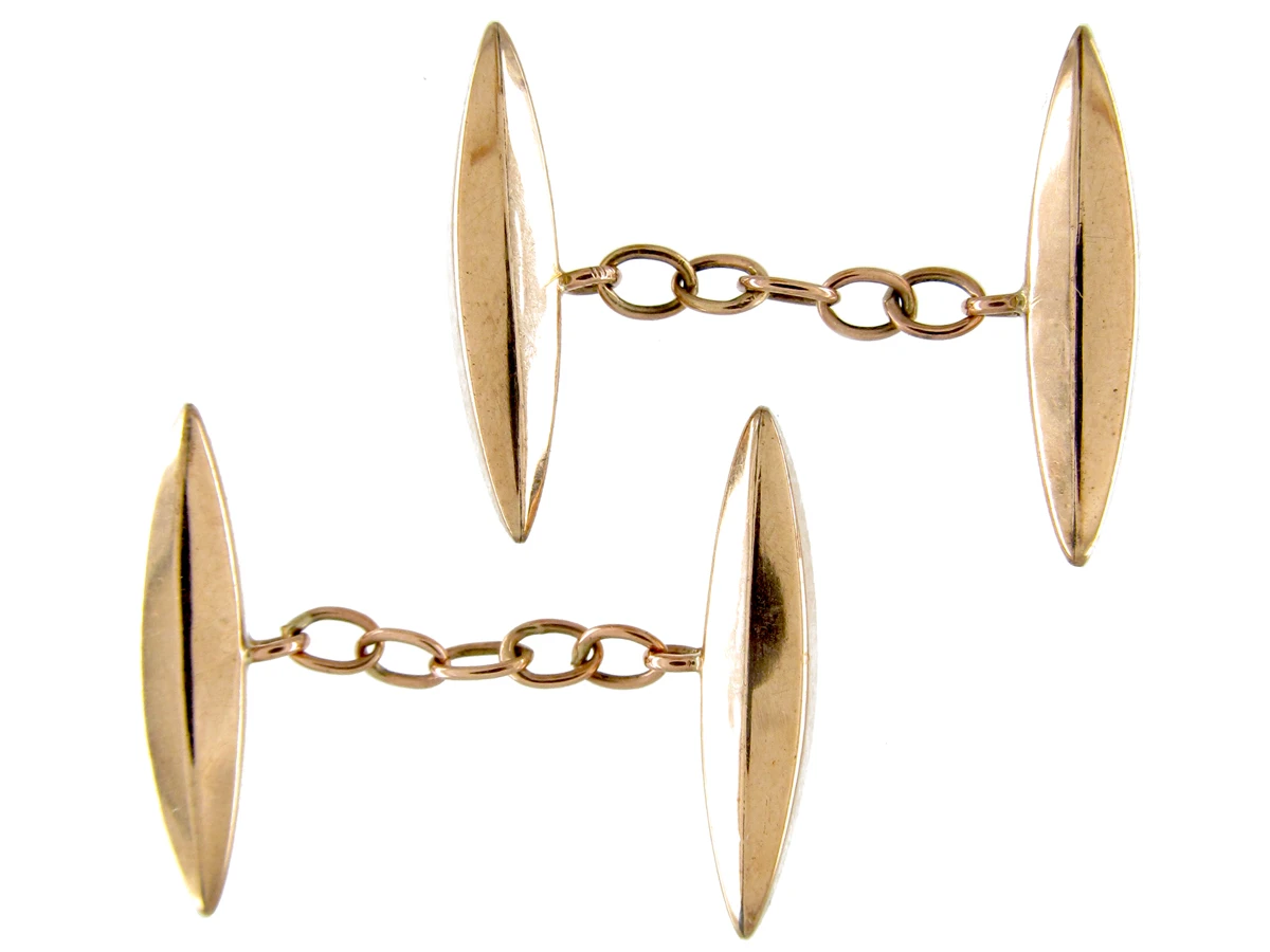 These cufflinks are a simple clever design and wearable every day. They are 9ct37.5% pure gold (or 375 parts pure gold and 625 parts other metals) gold and were made circa 1910=1920.