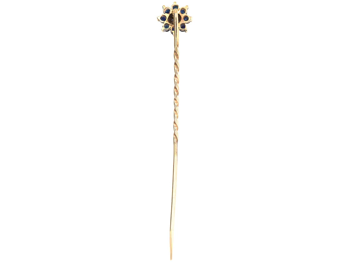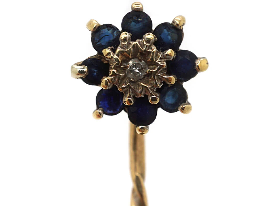 A good 9ct37.5% pure gold (or 375 parts pure gold and 625 parts other metals) gold tie pin that has been set with eight dark sapphires with a small diamondA precious, lustrous gemstone made of highly compressed carbon. Diamonds are one of the hardest materials known to mankind. Colours of diamonds range from colourless, yellow, orange and brown to almost black. Natural coloured (or ‘fancy’) diamonds can be extremely rare. The cut, colour, clarity and carat weight of a diamond are the criteria jewellers use… in the centre. All our tie pins come with a stopper at the end of the pin.