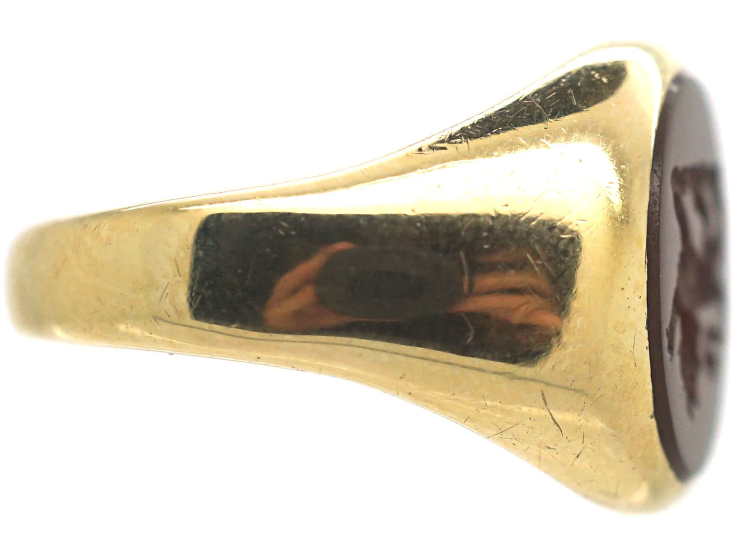 A good 9ct37.5% pure gold (or 375 parts pure gold and 625 parts other metals) gold signet ringA ring with a central plaque on which one’s initials, a seal, or a crest is engraved. set with an oval carnelian​A translucent red variety of chalcedony which in its turn is a form of cryptocrystalline quartz. ​Carnelian has​ been known and used since antiquity when it was sourced from the surfaces of the Egyptian and Arabian deserts. The ​most prized carnelian has a true blood-red color. that features a lion intaglioAn engraved stone, the opposite of a cameo, with a recessed design cut below the surface of the stone. Intaglio designs are common for signet rings and fob seals. with paw outstretched. It was made in 1963 by the well known firm Charles Green & Sons.