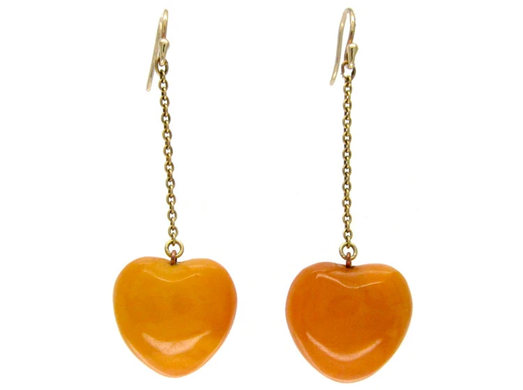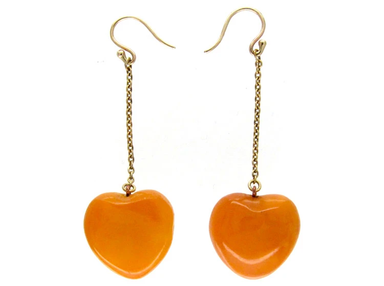 These earrings are really stunning. They are a good colour Baltic amberA fossilized tree resin dating from 100,000 to 3 million years old, typically yellow to brown in colour, and very rarely, cherry red. The most commercial source of Amber is in Northern Europe around the Baltic Sea, with a lot of that material treated to improve its transparency., in heart shapes, suspended on fine gold chains to wired tops.