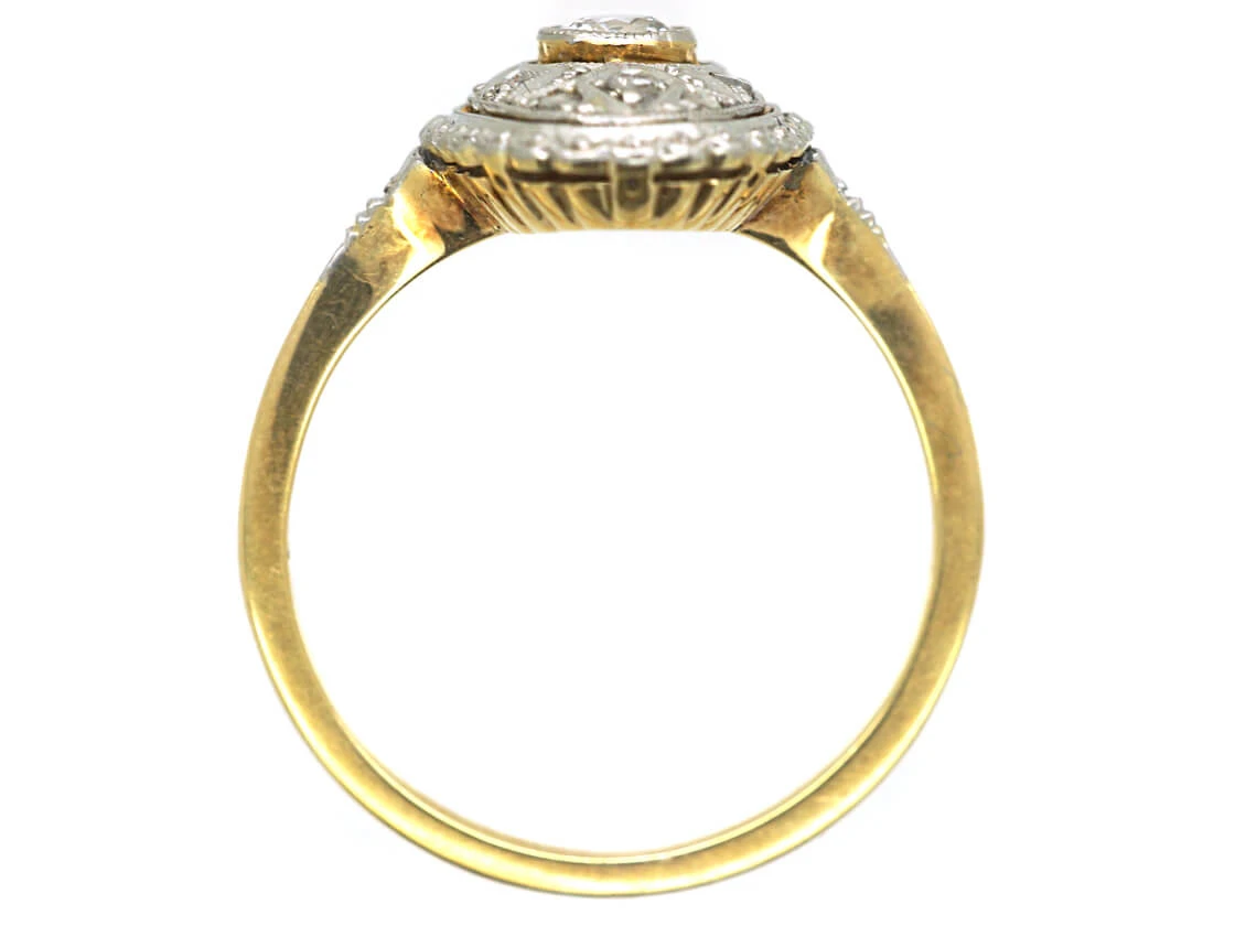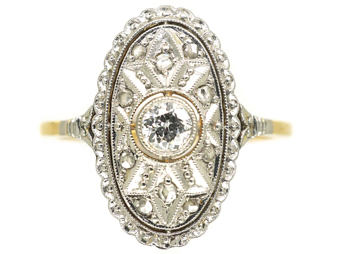 A lovely Art DecoA movement within the arts between the two Great Wars (1920-1935) across Europe and the US, characterized by its clean, geometric designs. The aesthetic was intended to celebrate an age of progress and the modernity of the machine. 14ct58.5% pure gold (or 585 parts pure gold to 415 parts other metals) gold ring that was made in the early 1920s. It has a yellow gold shankThe circle of metal that attaches to the decorative part of a ring and encircles the finger. and a white goldWhite gold is an alloy of gold and at least one other white metal – most often nickel or palladium (both of which act as a bleaching agent to reduce the natural yellow colour of the gold). top with a twenty pointA unit of weight for a diamond, being one-hundredth of a metric carat. It is used for weights that are decimal fractions of a carat, and all figures after the second decimal point are, in the diamond and jewellery trade, generally discarded. diamondA precious, lustrous gemstone made of highly compressed carbon. Diamonds are one of the hardest materials known to mankind. Colours of diamonds range from colourless, yellow, orange and brown to almost black. Natural coloured (or ‘fancy’) diamonds can be extremely rare. The cut, colour, clarity and carat weight of a diamond are the criteria jewellers use… in the centre and small rose diamonds around it. It is a pretty design with millgrain detail on the edges of the gold work and would make a wonderful engagement ring.