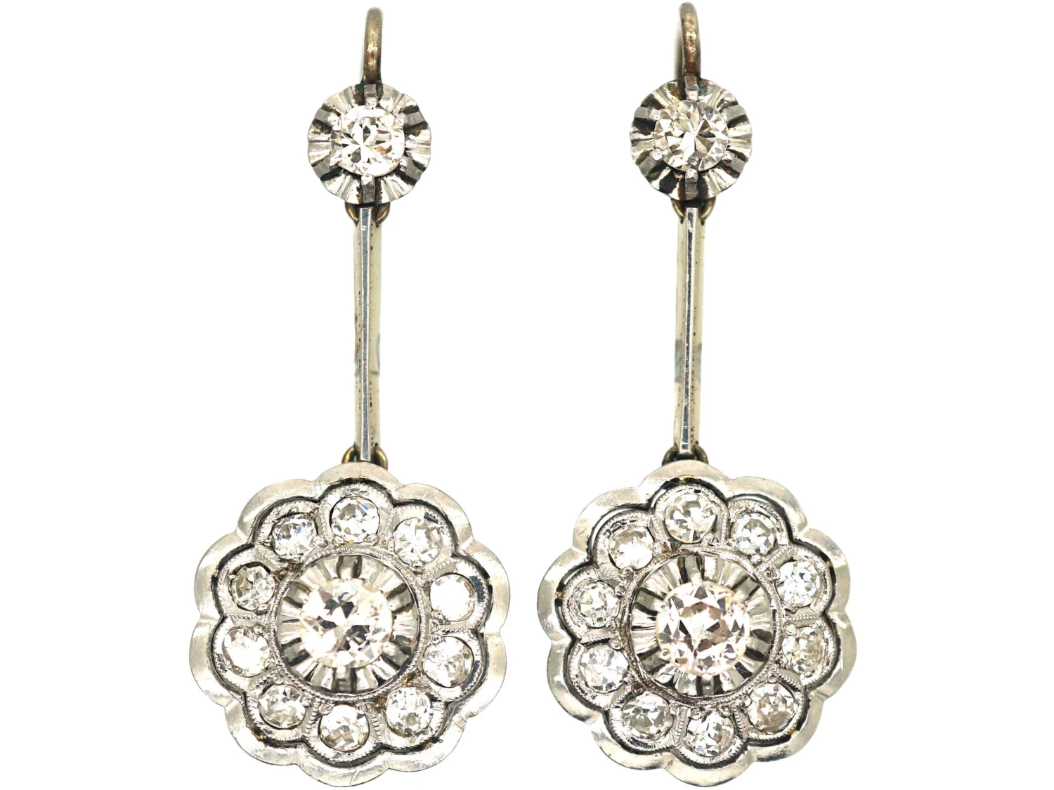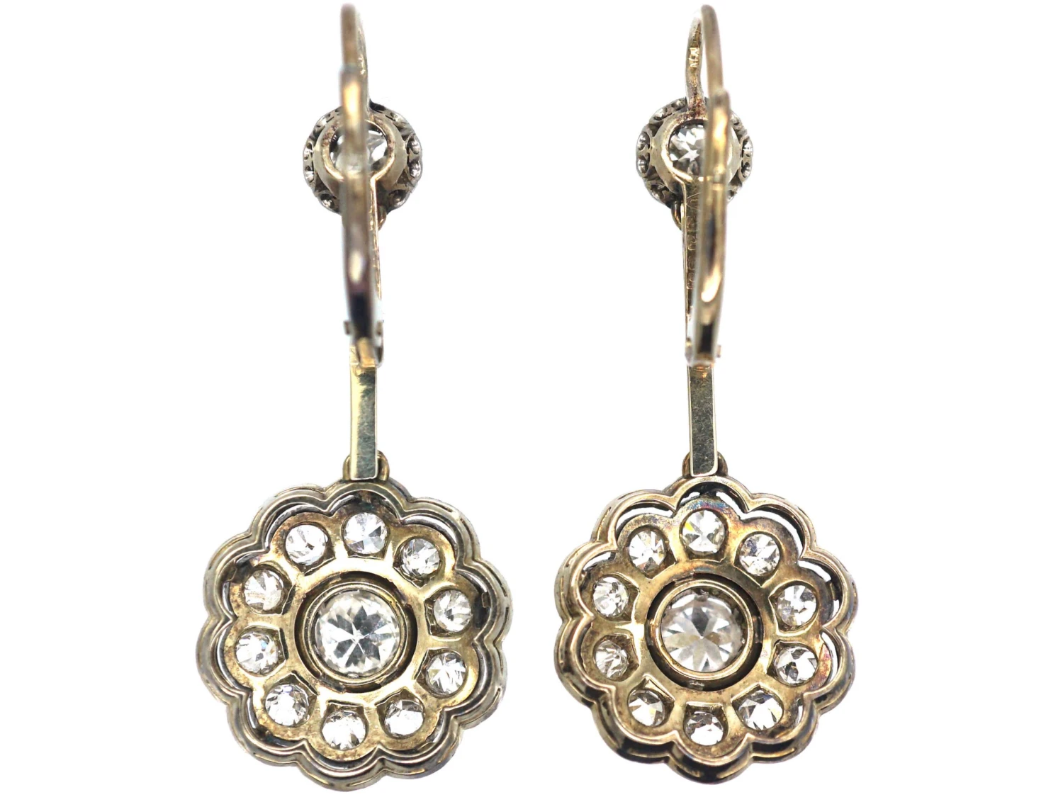 A striking pair of 14ct58.5% pure gold (or 585 parts pure gold to 415 parts other metals) gold drop earrings that were made circa 1920 in either Austria or Germany. They have been set with well matched white diamonds in scallop settings with millgrain detail. This is when the edges of the metal have been worked with a knurling tool to produce tiny beads, hence the French name “millgrain”, meaning a thousand beads. They look beautiful when worn.