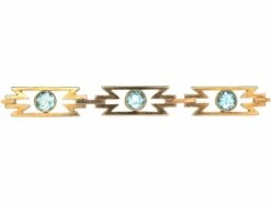 A stylish and unusual articulatedIn jewellery, an articulated piece is composed of segments with flexible connections. 15ct62.5% pure gold (or 625 parts pure gold and 375 parts other metals). Popular during the Victorian, Edwardian and Art Deco eras but was discontinued in the mid-1930s. gold bracelet that was made in the 1920-1935 period. It has been set with nine aquamarines within a zig zag Aztec design. It look fantastic when worn