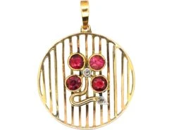 A charming 15ct62.5% pure gold (or 625 parts pure gold and 375 parts other metals). Popular during the Victorian, Edwardian and Art Deco eras but was discontinued in the mid-1930s. gold pendant that was made circa 1910-1925. It is a striking round design with gold bars and a flower that has been set with four rubies and a rose diamondA precious, lustrous gemstone made of highly compressed carbon. Diamonds are one of the hardest materials known to mankind. Colours of diamonds range from colourless, yellow, orange and brown to almost black. Natural coloured (or ‘fancy’) diamonds can be extremely rare. The cut, colour, clarity and carat weight of a diamond are the criteria jewellers use… in the centre and a further rose diamond on the end of the stem. Easy to wear every day and a perfect gift.
