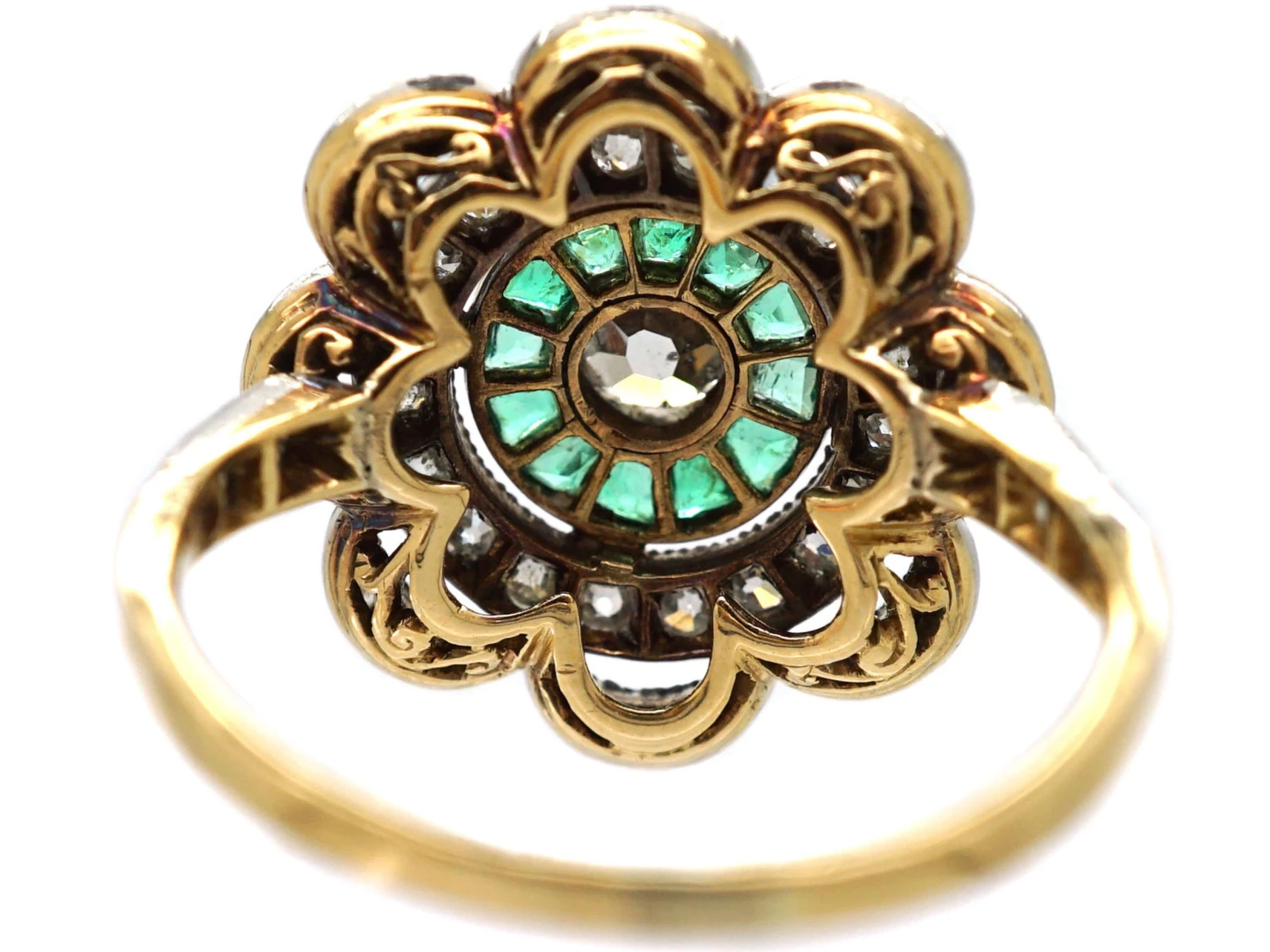 There is something about the Art DecoA movement within the arts between the two Great Wars (1920-1935) across Europe and the US, characterized by its clean, geometric designs. The aesthetic was intended to celebrate an age of progress and the modernity of the machine. style that is at once delicate but also so very determined. This ring is no exception – beautiful, brilliant and ready for anything. The central Old European cutGemstones cut in this style have a smaller table than the round brilliant and the overall depth is greater. This style of cutting was popular in the 19th Century and is the direct predecessor to the modern round Brilliant Cut. Similar to the Old Mine Cut. diamondA precious, lustrous gemstone made of highly compressed carbon. Diamonds are one of the hardest materials known to mankind. Colours of diamonds range from colourless, yellow, orange and brown to almost black. Natural coloured (or ‘fancy’) diamonds can be extremely rare. The cut, colour, clarity and carat weight of a diamond are the criteria jewellers use… is raised above a border of calibre cutTypically small, fancy-cut faceted stones in the shape of rectangles, squares, oblongs or other specialty shapes cut to fit very closely together in a setting to create a design that often outlines or accents a larger motif. Calibre-cut comes from the word calibration which means to divide or mark with gradations. This style of stone cutting was made popular… emeralds, which, in turn, are surrounded by a border of pretty little single cutA round stone with just 18 facets, top and bottom, used only on very small stones. diamonds in a millegrainA tiny decorative feature – normally in platiunum – in which minute beads of metal are raised along the edge of a setting, which adds texture and enhances the sparkling effect. setting. But it does not stop there. The diamond set scalloped border brings this ring to full bloom. It sits low on the finger so it is a practical ring to wear.