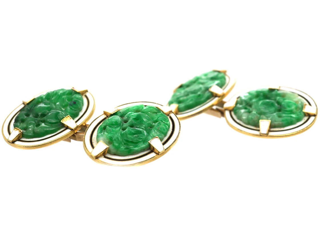 A rare pair of 18ct75% pure gold (or 750 parts pure gold and 250 parts other metals) gold Art DecoA movement within the arts between the two Great Wars (1920-1935) across Europe and the US, characterized by its clean, geometric designs. The aesthetic was intended to celebrate an age of progress and the modernity of the machine. cufflinks that were made in the 1920s. Each link has been set with an oval carved jadeA semi-precious stone that ranges in colour. Translucent jade is more highly valued than opaque jade. Jade is often cabochon cut. Stones with imperfections are usually carved. Two different minerals are known as jade: jadeite and nephrite. The Chinese have prized jade for thousands of years and regard it as having medicinal properties when worn or ingested a… plaque. Around the plaques are two bands of white enamelA pigmented glass-like material used in powdered form and fused onto the metal surface of a piece of jewellery. with enamelled claws. They are so typical of the Art Deco period and are pretty special.