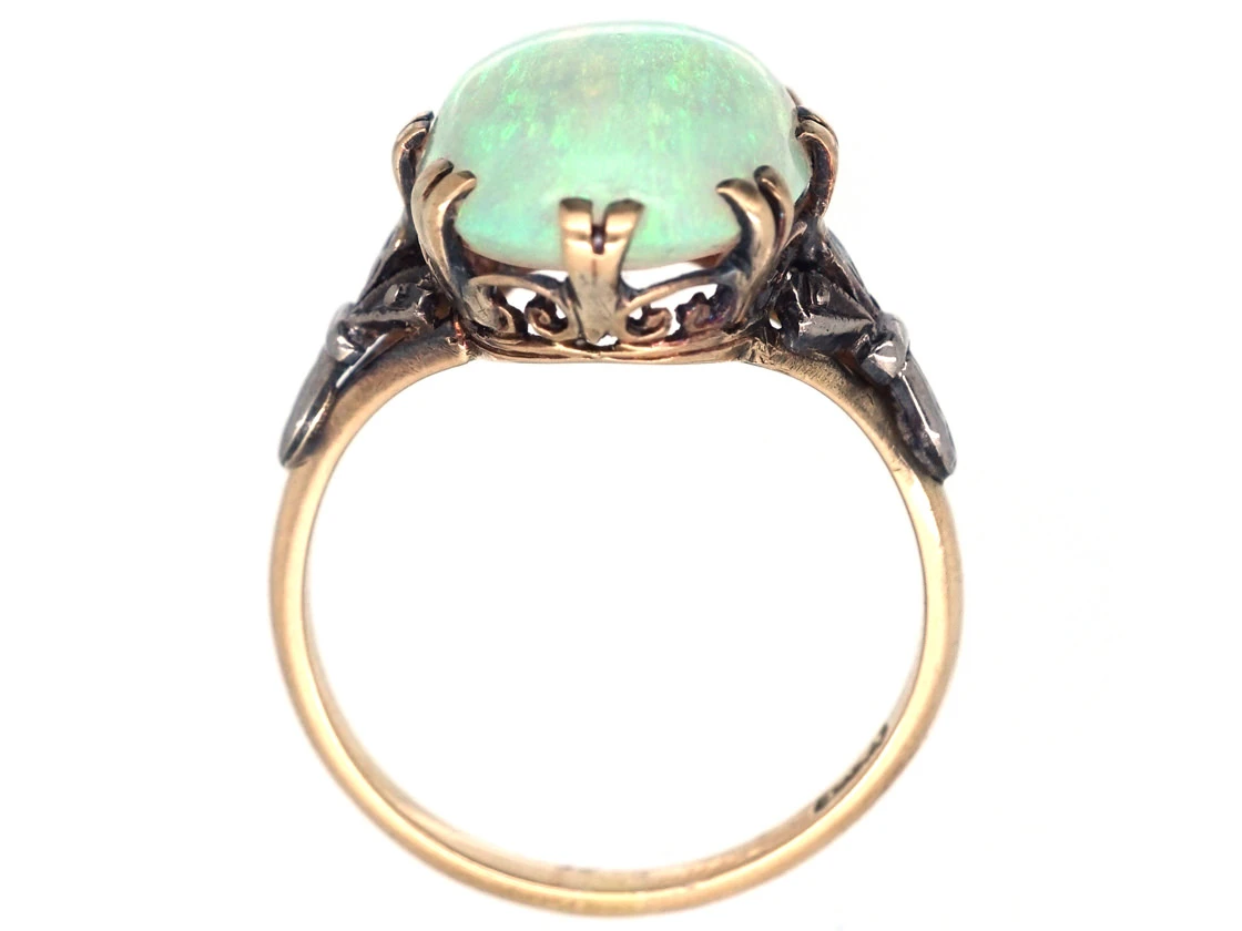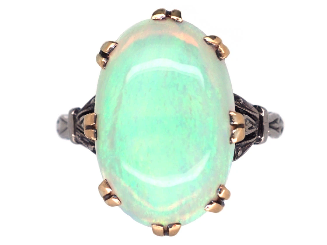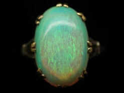 opalOpals occur in a range of body colours from white, black or grey, bright orangey red and a pale watery colour. The most precious opals show strong colour contrast and generally have a dark body colour with a vivid array of colour play.. It is a fantastic predominantly green colour and weighs over five caratsThe unit of weight for a diamond or other gemstone and also for a pearl. Abbreviated ‘ct’, 1 carat is equal to 0.2 grams. In reference to gold, a unit of purity or fineness of gold and gold alloy, expressed as a number out of 24 parts by weight, e.g. ’24 carat’ signifies pure gold, ’18 carat’ 18/24th gold in the alloy, et cetera. Also abbreviated as ‘c…. If you love opals this is a good ring to choose.