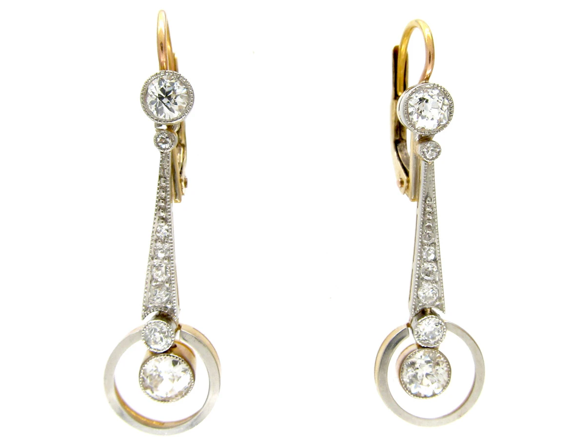 A fine pair of Art DecoA movement within the arts between the two Great Wars (1920-1935) across Europe and the US, characterized by its clean, geometric designs. The aesthetic was intended to celebrate an age of progress and the modernity of the machine. drop diamondA precious, lustrous gemstone made of highly compressed carbon. Diamonds are one of the hardest materials known to mankind. Colours of diamonds range from colourless, yellow, orange and brown to almost black. Natural coloured (or ‘fancy’) diamonds can be extremely rare. The cut, colour, clarity and carat weight of a diamond are the criteria jewellers use… earrings, articulatedIn jewellery, an articulated piece is composed of segments with flexible connections. to move when worn on the ear.