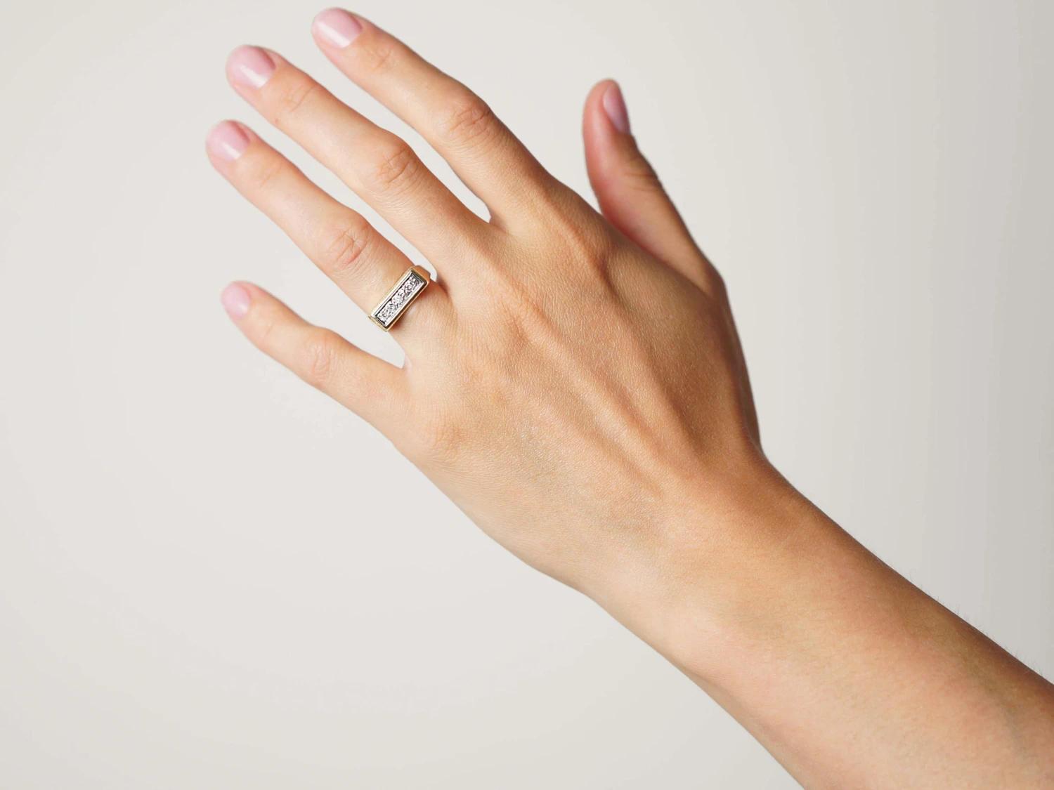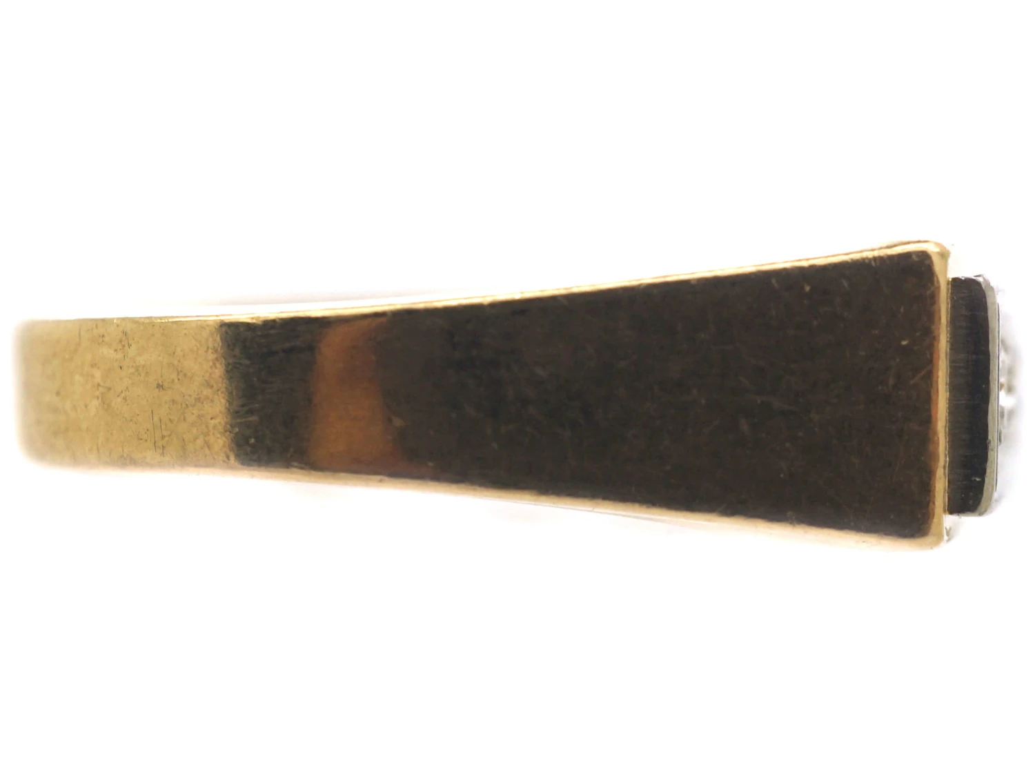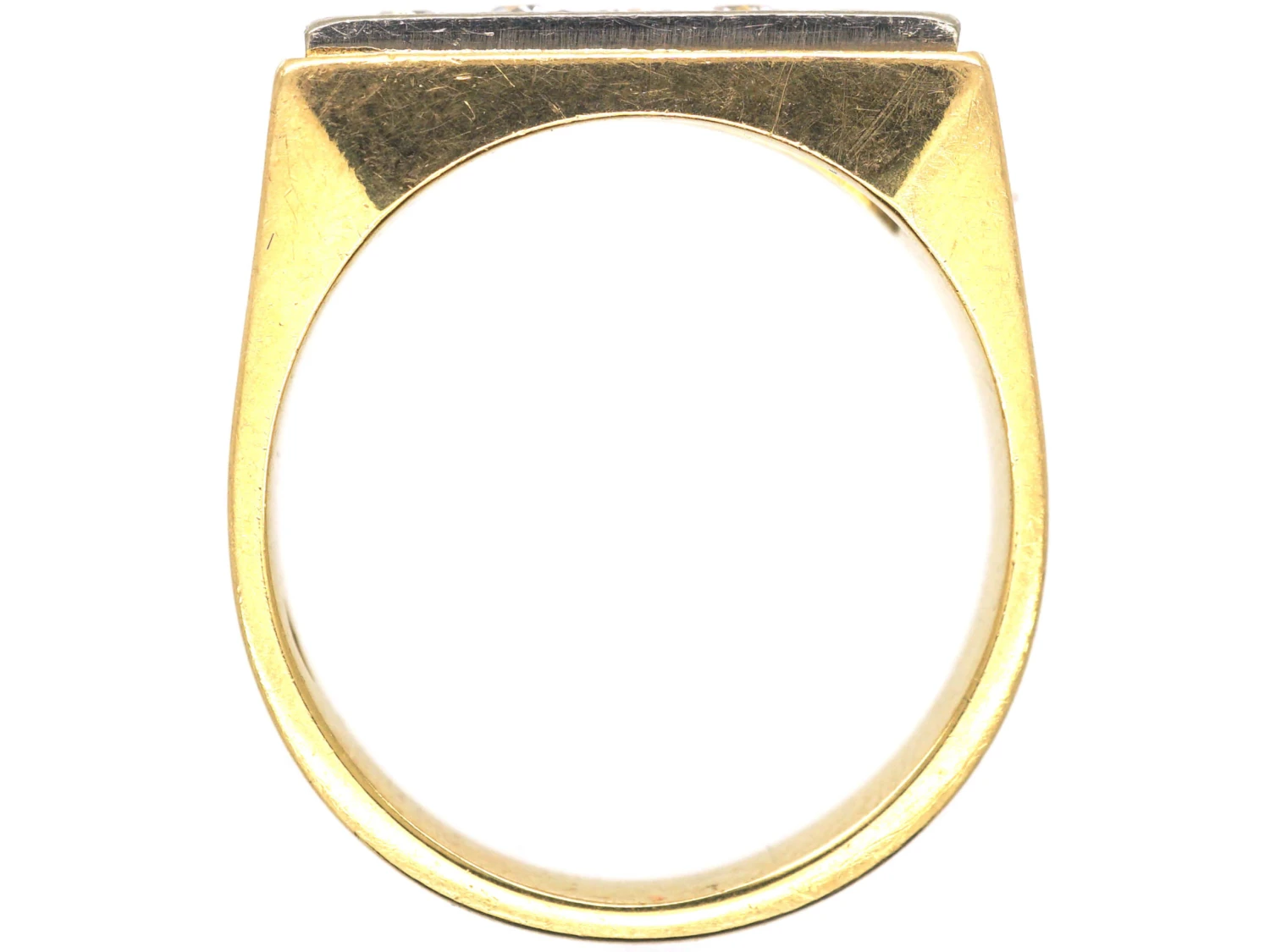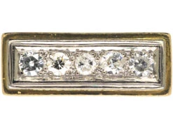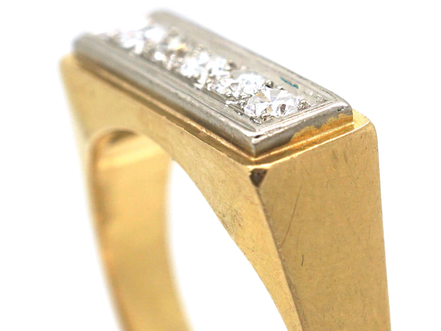 A smart 18ct75% pure gold (or 750 parts pure gold and 250 parts other metals) gold ring that has been set with five diamonds in a line within a platinumDerives from the Spanish word ‘platina’ meaning ‘little silver’. Acknowledged since the 1900s, platinum’s durability and natural brightness has been and still is today highly treasured A metallic element prized for its rarity, whiteness, high tensile strength and insusceptibility to corrosion, platinum first became widely used in jewellery in the late ninete… framework. The sides of the shankThe circle of metal that attaches to the decorative part of a ring and encircles the finger. are a strong canted design. It was made in the 1930s and is most likely of Belgian origin. It would make an unusual engagement or dress ring.