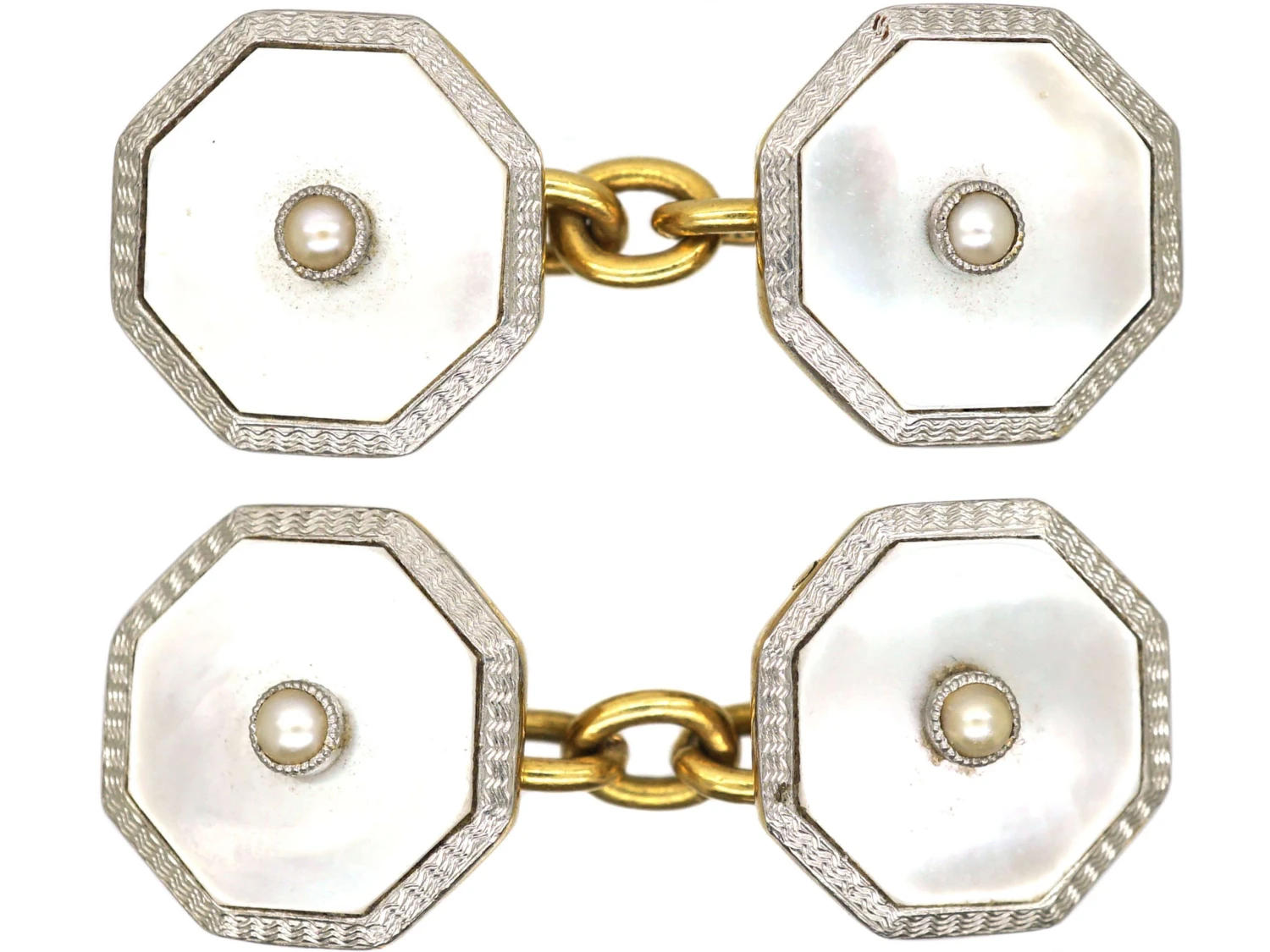 A pair of cufflinks which were made in the Art DecoA movement within the arts between the two Great Wars (1920-1935) across Europe and the US, characterized by its clean, geometric designs. The aesthetic was intended to celebrate an age of progress and the modernity of the machine. period in the 1920s. Each cufflink has been set with a naturalA natural stone is called such because it has not been subjected to any treatments. split pearlNatural pearls are an organic gem formed inside live mollusc shells and come in all shapes and sizes. They are formed as the result of a natural irritant within the mollusc’s mantle and as a defence, layers of iridescent nacre form over the top of it, creating a pearl. above an octagonal plaque of mother of pearlThe iridescent inner layer of certain molluscs such as oysters or abalones which is used as a decorative inlay.. This geometric form is typical of Art Deco jewels. The edge is platinumDerives from the Spanish word ‘platina’ meaning ‘little silver’. Acknowledged since the 1900s, platinum’s durability and natural brightness has been and still is today highly treasured A metallic element prized for its rarity, whiteness, high tensile strength and insusceptibility to corrosion, platinum first became widely used in jewellery in the late ninete… and the reverse is 18ct75% pure gold (or 750 parts pure gold and 250 parts other metals) gold. A lovely gift for a 21st present perhaps?