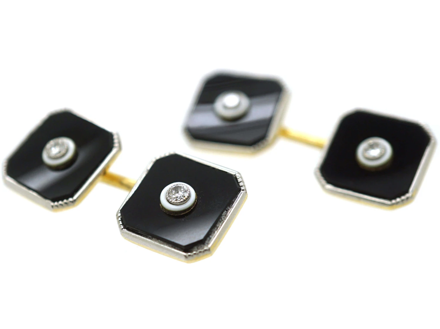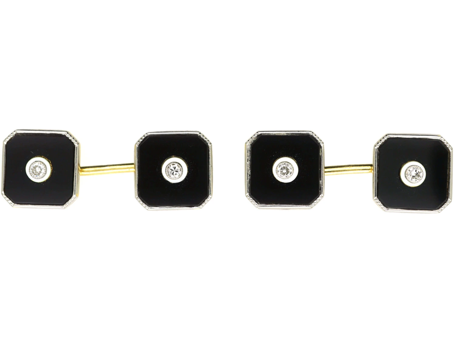 A good pair of Art DecoA movement within the arts between the two Great Wars (1920-1935) across Europe and the US, characterized by its clean, geometric designs. The aesthetic was intended to celebrate an age of progress and the modernity of the machine. cufflinks that were made in the 1920s. They are typical of the period with their square geometric design with canted corners. In the middle of each cufflink is a diamondA precious, lustrous gemstone made of highly compressed carbon. Diamonds are one of the hardest materials known to mankind. Colours of diamonds range from colourless, yellow, orange and brown to almost black. Natural coloured (or ‘fancy’) diamonds can be extremely rare. The cut, colour, clarity and carat weight of a diamond are the criteria jewellers use… in a platinumDerives from the Spanish word ‘platina’ meaning ‘little silver’. Acknowledged since the 1900s, platinum’s durability and natural brightness has been and still is today highly treasured A metallic element prized for its rarity, whiteness, high tensile strength and insusceptibility to corrosion, platinum first became widely used in jewellery in the late ninete… setting. Around each diamond is a circle of white enamelA pigmented glass-like material used in powdered form and fused onto the metal surface of a piece of jewellery. which makes these cufflinks just a little special!