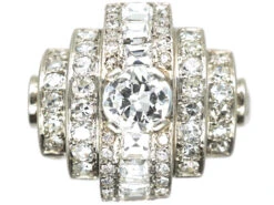 A stylish 18ct75% pure gold (or 750 parts pure gold and 250 parts other metals) white goldWhite gold is an alloy of gold and at least one other white metal – most often nickel or palladium (both of which act as a bleaching agent to reduce the natural yellow colour of the gold). ring that was made in the 1920s most likely in Germany. It is a wonderful strong geometric design and has been set with a central round transition cutDirect descendants of the Old European Cut, this progressive cuts saw an evolution toward a larger table, a lower crown, and a smaller culet than previous cuts. However, unlike later brilliants, the girdles of these stones remained unfaceted. Considered a precursor to both the Modern Round Brilliant and the Ideal cuts. diamondA precious, lustrous gemstone made of highly compressed carbon. Diamonds are one of the hardest materials known to mankind. Colours of diamonds range from colourless, yellow, orange and brown to almost black. Natural coloured (or ‘fancy’) diamonds can be extremely rare. The cut, colour, clarity and carat weight of a diamond are the criteria jewellers use… with a line of small diamonds on either side with square cut diamonds in between. It has step cutA step cut is a style of cutting a gemstone characterised by straight sides with parallel facets. Most often, step cut stones are square or rectangular. sides set with two more rows of diamonds. It has interesting zig zag engraved decoration on the sides and shouldersThe point on a ring where the central section meets the shank or band, often carved, decorated or inlaid with small diamond accent stones.. It would make a terrific engagement or dress ring.